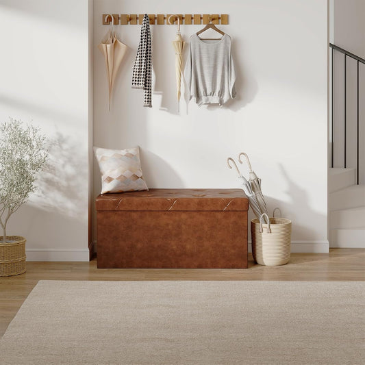 Sweetcrispy 43 Inches Folding Ottoman with Storage Bench, Foot Rest Stool, End of Bed Storage Bench Upholstered, Load 660 lbs, for Living Room, Synthetic Leather, Brown