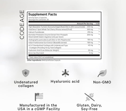 Codeage Supreme Joint Health, UC-II Collagen Capsules Type II, VitaCherry Sport Cherries, Boron, Calcium Fructoborate, Hyaluronic Acid, Turmeric, Bromelain & Boswellia Supplement, Non-GMO, 60 Count