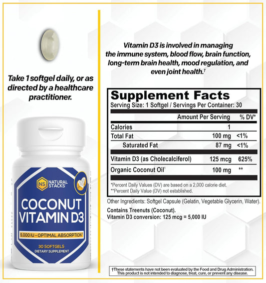 NATURAL STACKS Vitamin D 5000 IU Supplement - with Coconut Oil for Optimal Absorption - Vitamin D Pills for Immunity & Cell Growth - D3 125mcg Cholecalciferol Supplement - 30 D3 Servings