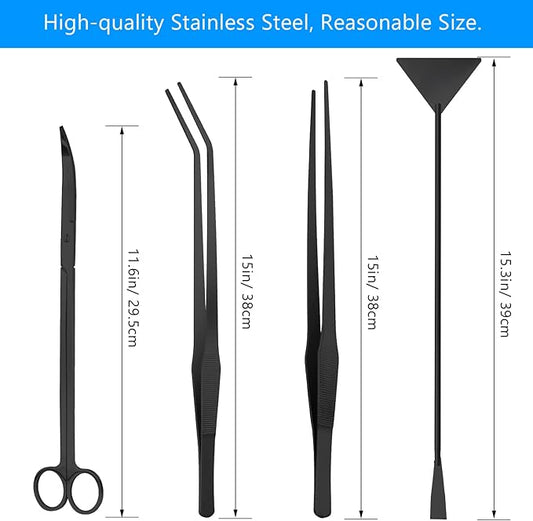 Aquarium Aquascape Tools Kit 15in, 4 in 1 Anti-Rust Aquatic Plant Aquascaping Tool Stainless Steel Tweezer Scissor Spatula for Aquarium Tank Clean Fish Tank Aquascape Accessories Set (black)