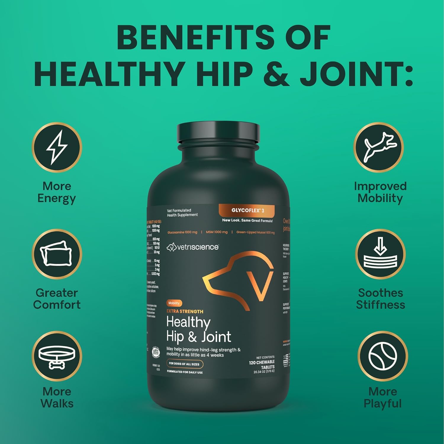 VetriScience Glycoflex 3 Clinically Proven Hip and Joint Supplement for Dogs - Maximum Strength Dog Supplement with Glucosamine, MSM, Green Lipped Mussel & DMG - 120 Chewable Tablets, Chicken Flavor
