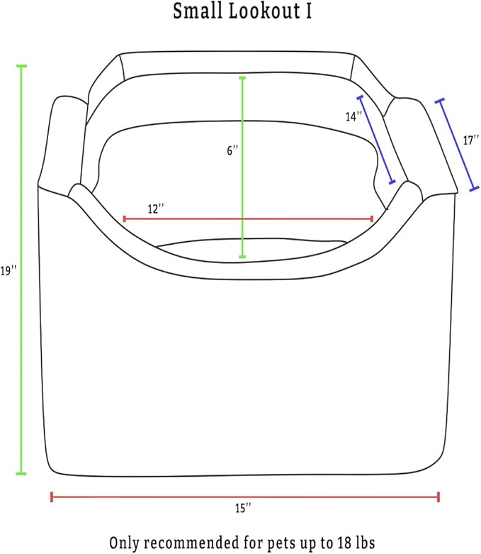 - This dog booster car seat for dogs small 5-15 lbs raises your pup 6” to allow for viewing out of the window. The removable pillow can add additional height if necessary. The enveloping microsuede interior is 12” x 14” and boasts 6” tall sidewalls to secure small breed dogs under 10” in length (like pomeranians, chihuahuas, and yorkies) within the dog car seat. The Lookout dog car seat measures 17″H x 15″W x 19″L and is an ideal back seat or front seat dog car seat, fitting inside a single seat.
