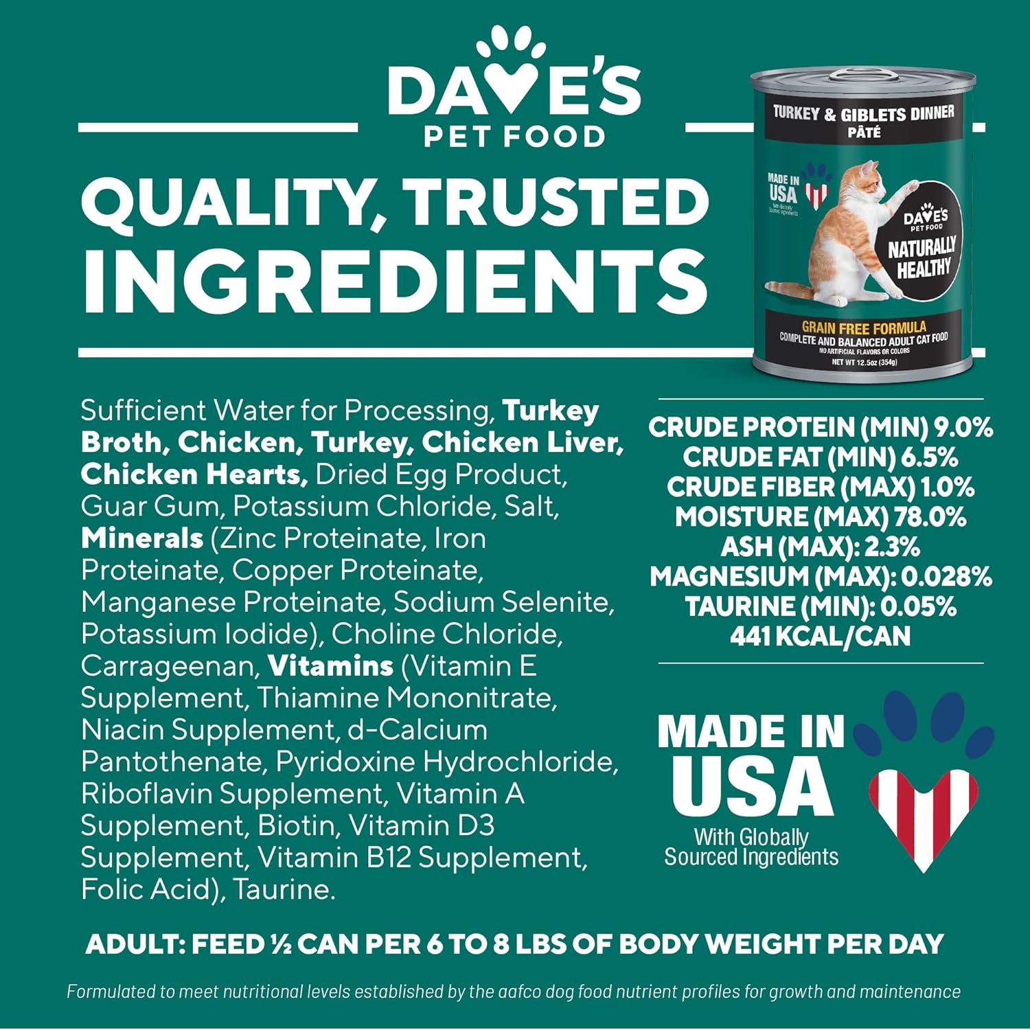 Dave's Pet Food Grain Free Canned Cat Food (Turkey & Giblets Pate), Made in USA Naturally Healthy Canned, Canned Pate, 12.5 oz Cans (12 Pack)