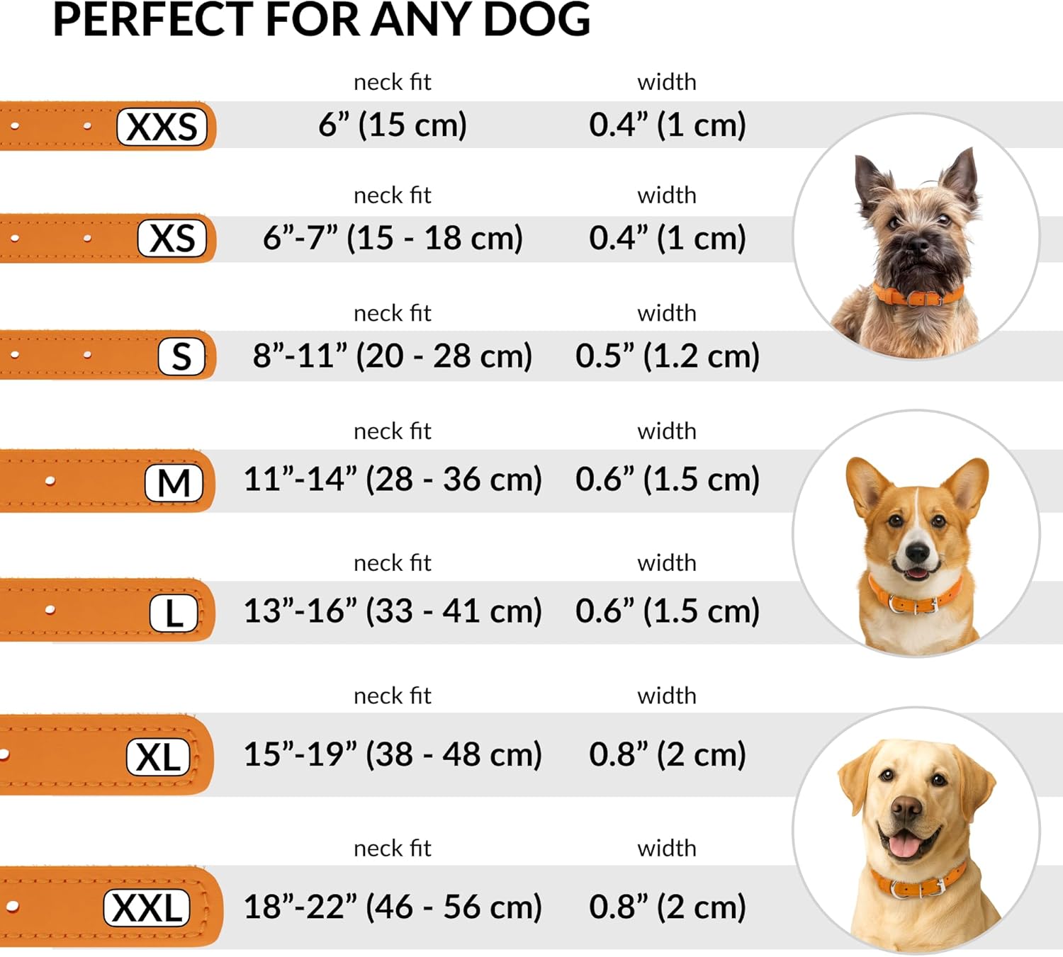 - SUITABLE FOR ALL BREEDS: Our dog collars for small dogs and big dogs come in a variety of sizes. Please check out our size chart before purchasing a leather collar for dogs. The dog collar leather is 0.8 inches wide, 25 inches long, and neck sizes of 18 - 22 inches.