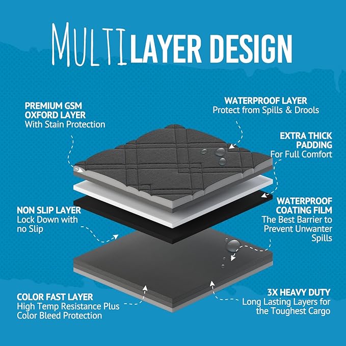 - Waterproof Layers: Ensure pet accidents or any spilled liquids from staining and absorbing into your cargo liner or seats. Each thick layer are made ultra-waterproof that resist any spills. For a quick cleanup, you can wipe the cover down with a damp cloth, or throw it in the washing machine for bigger messes.
