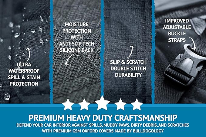- Heavy Duty Protector: Defend your cargo and trunk liner area against dog hair, muddy paws, dirty debris, scratches, spills, stains, scratches, groceries, heavy equipment, beach sand, fur and other unwanted accidents. Bulldogology Dog proof Pet cargo covers includes side flaps and extra thick layers for all-around protection. Regardless of what your pet may put it through, our dog car seat covers are crafted with 2x stitched quilted premium 600D GSM Oxford Material that Guarantees Lifetime Satisfaction