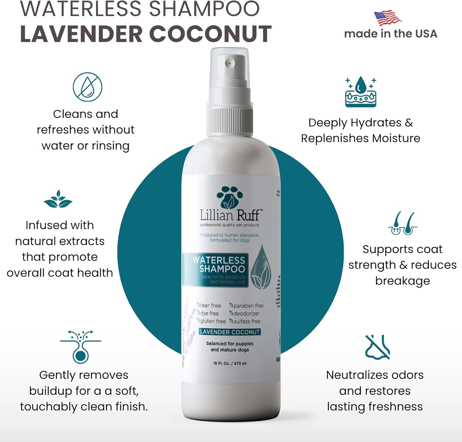 - Safe and Gentle Formulation: Prioritizing your pet's well-being, our Waterless pet shampoo is gentle yet effective. Enriched with Aloe, it is suitable for animals with sensitivities. Tough on dirt and smells, yet gentle on the skin, our Lillian Ruff Waterless Shampoo spray-on dry shampoos provide a comfortable and refreshing grooming experience.