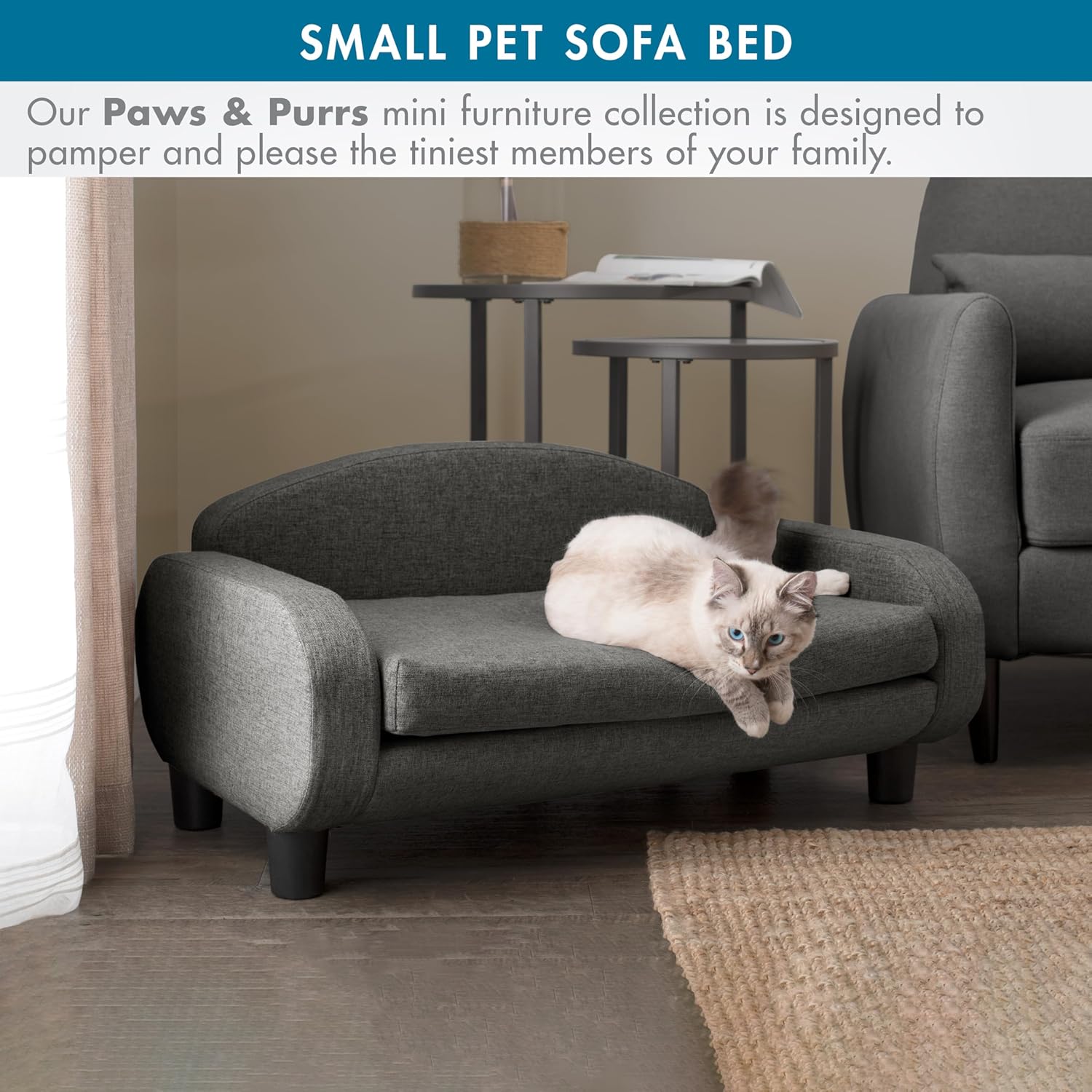 Paws & Purrs Cat Sofa Bed, Pet Couch for Indoor Cats Elevated Cat Beds with Removable Washable Mattress Cover for Kitten, Puppy or Small Animal- 31.5" Wide, Gray