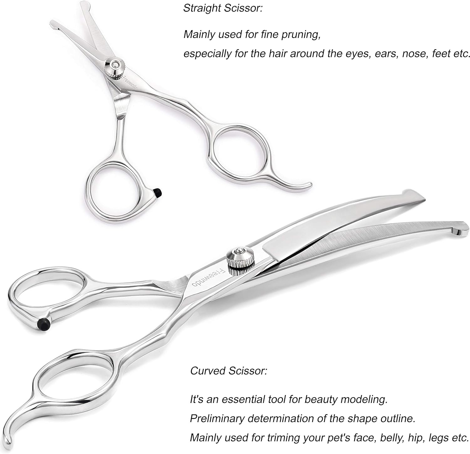 - A COMPLETE DOG GROOMING SCISSORS KIT: This kit includes 1 × 7.3'' Thinning Shears, 1 × 7.3'' Curved Scissors, 1 × 5.3'' Straight Scissors, 1 × Pet Comb, 1 × Dog Nail Clippers, 1 × Dog Nail File, 1 × Cleaning Cloth, and 1 × Black Leather Case. With this scissors for dogs kit you can trim any part of your pet such as body, face, eyes, nose, ears, tail, paw etc.