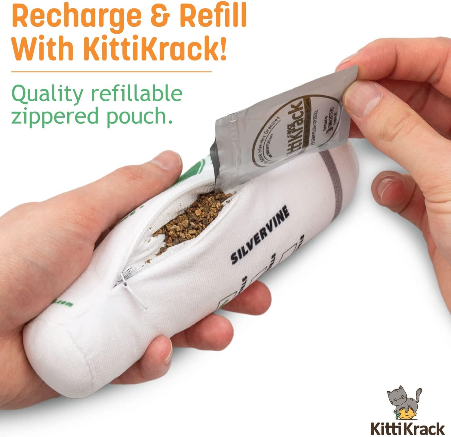 - Refillable Cat Toy: Each KittiBuzz plush cat toy is able to be refilled with TWINCRITTERS KittiKrack Rock refills so your furry friend can keep the fun going! Our silver vine cat and kitten toys are a great compliment to regular cat treats and are purr-fect for playing, teething, and can stand up to the signature "kitty kicking".
