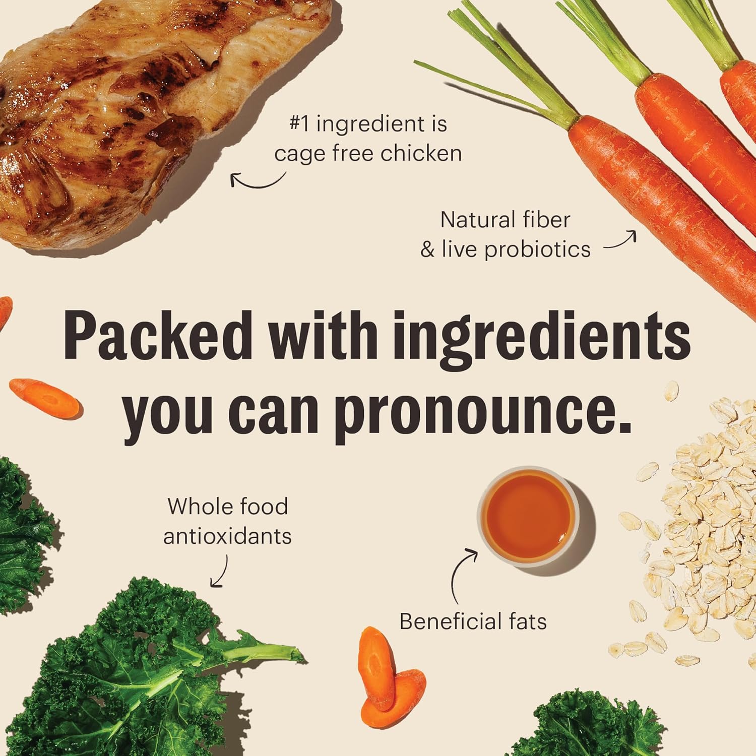- HUMAN GRADE: High quality, human grade ingredients such as cage-free chicken, oats, & vegetables. Produced to the same standards of quality & safety as the food you eat. Made in the USA with ingredients sourced from suppliers around the world.