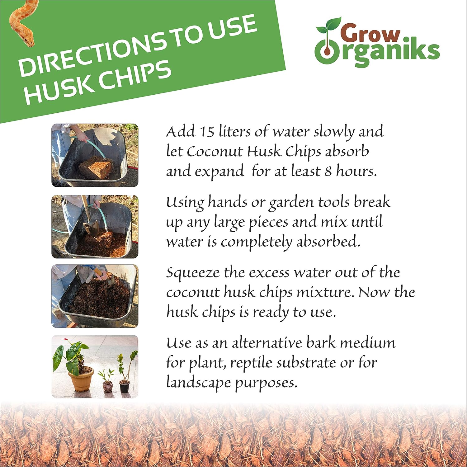- [🐍100% Natural & Biodegradable] Grow Organiks Coconut Husk chips are cut pieces of the husk of the coconut compressed into 11 lbs.Coconut husks are a sustainable alternative to other mulches. Our Organic coco chips are best suitable for growing plants, and also perfect for reptile substrate.