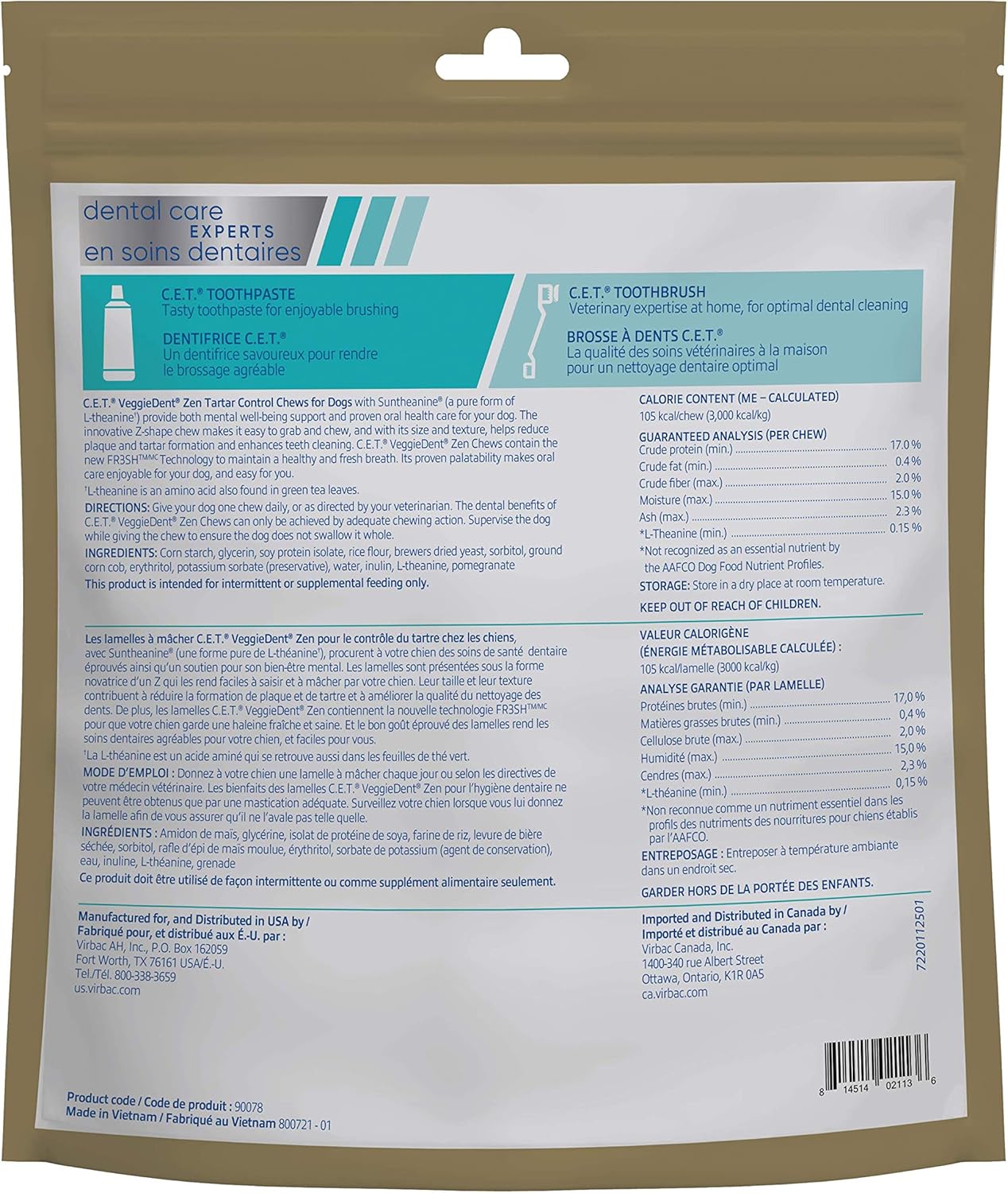 - FORMULATED WITH L-THEANINE: which is also found in green tea L-theanine used in VEGGIEDENT Zen Tartar Control Chews for Dogs comes from Suntheanine, which contains a pure form of L-theanine. Suntheanine is a registered trademark of Taiyo International.