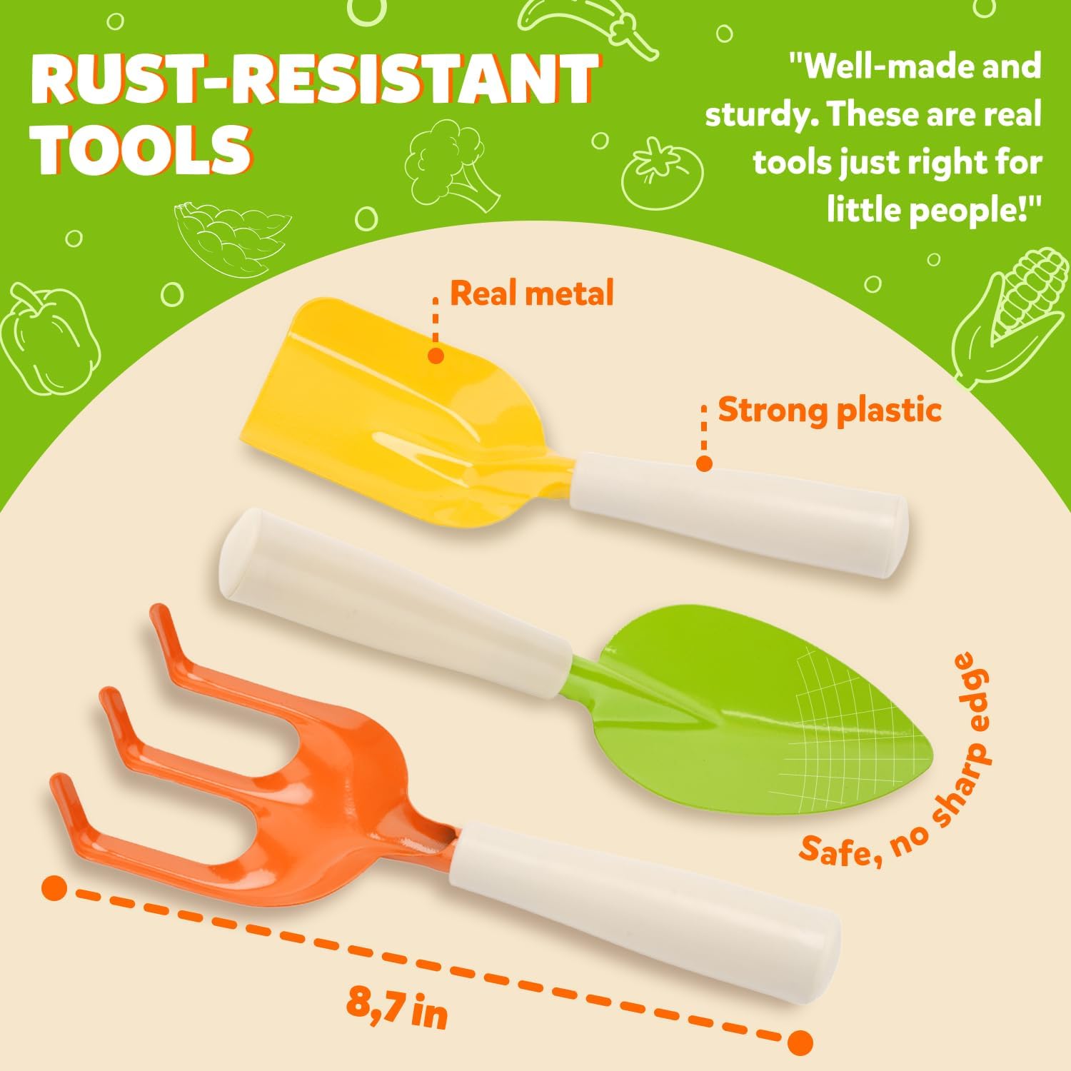 - SAFE DESIGN – NO SHARP EDGES – Tools have rounded, child-friendly edges—sturdy yet safe! “The tools are strong but safe, and the gloves fit perfectly.”