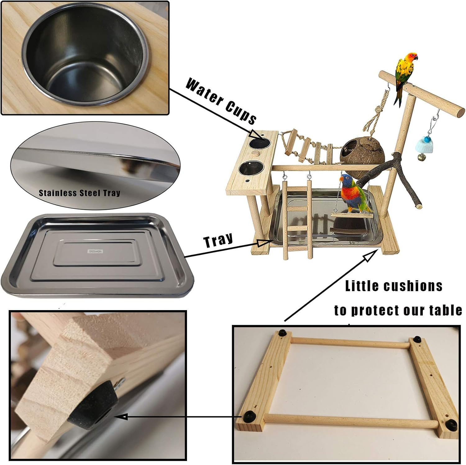 Parakeet Playground Bird Play Stand Natural Wood Perch Gym Parrots Nest Climb Swing Ladders with Feeder Cups Lovebirds Cage Accessories Toy Exercise Activity for Conure Cockatiel Lovebirds