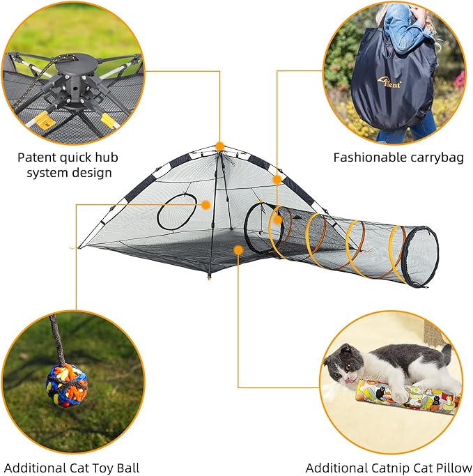 - INCLUDES ONE CAT TENT ,ONE CAT TUNNEL and ONE BALL (Random color) – Includes one cat tent with too big zipper doors, one cat tunnel with a zippered door at both ends and one ball for cats to play. Cat tent and cat tunnel can be used together or separately.