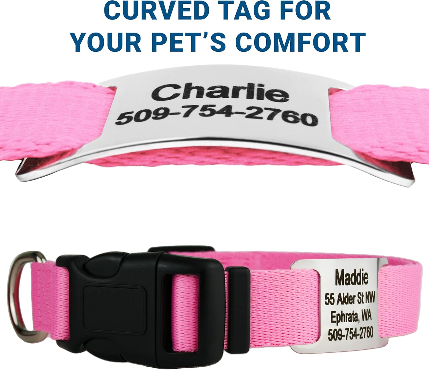 GoTags Personalized Dog Collar with Nameplate, Adjustable Dog Collar with Custom Engraved Slide On Pet ID Tag in Stainless Steel, Silent, No Noise Dog Tag for Large Medium and Small (Pink, Medium)