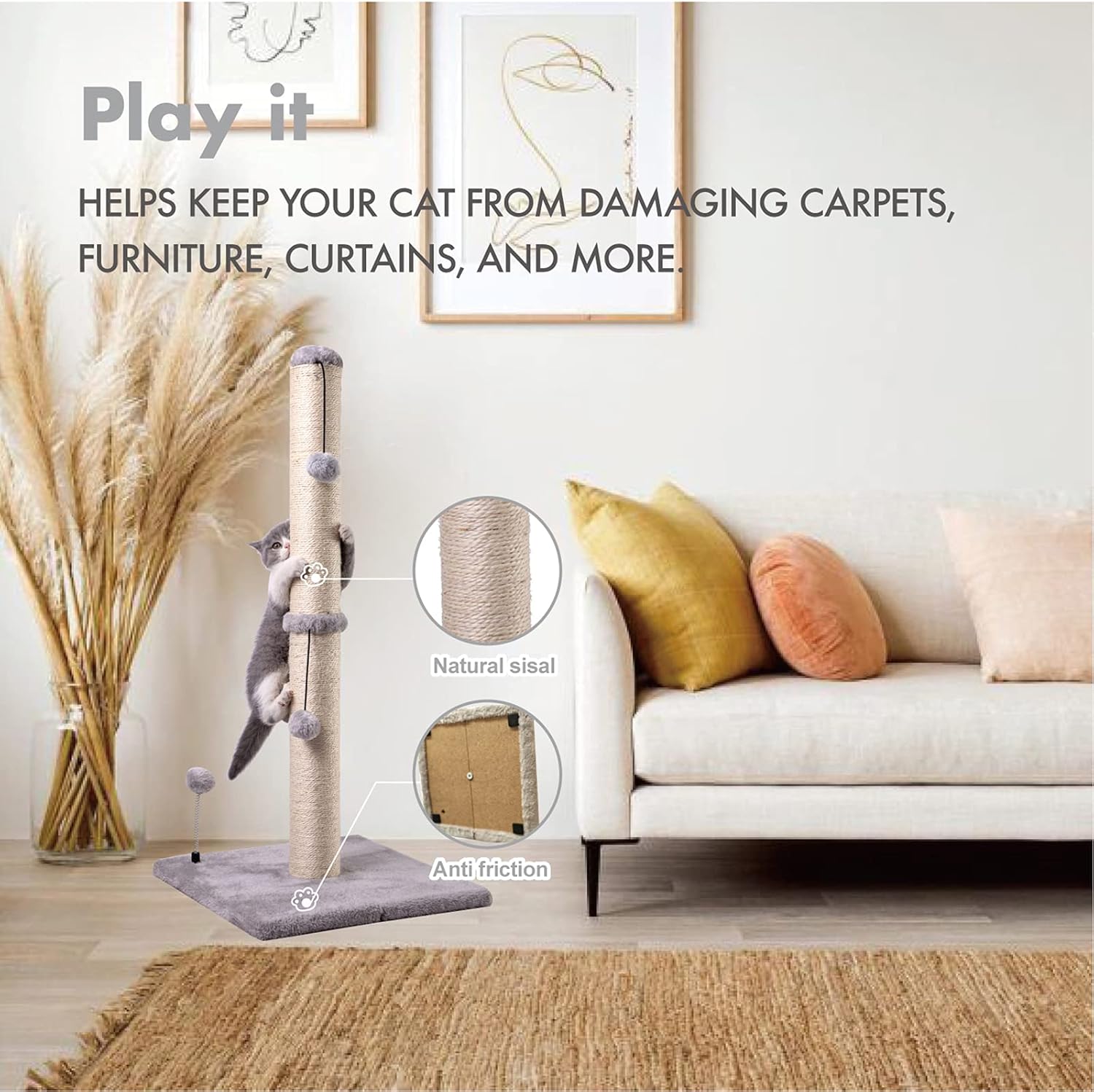 - Protect your furniture- Grab sticks and plush toys combine to attract cats to play and grab, natural sisal is suitable for cats to grab, effectively preventing cats from grabbing furniture .