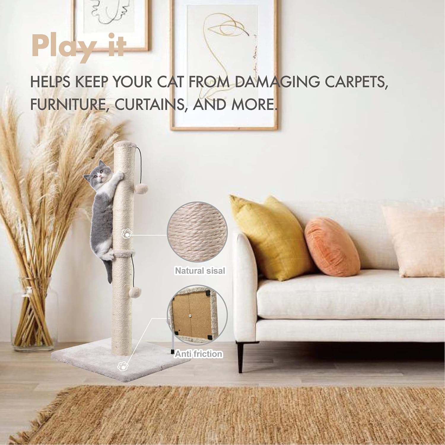 - Protect your furniture: - Grab sticks and plush toys combine to attract cats to play and grab, natural sisal is suitable for cats to grab, effectively preventing cats from grabbing furniture .