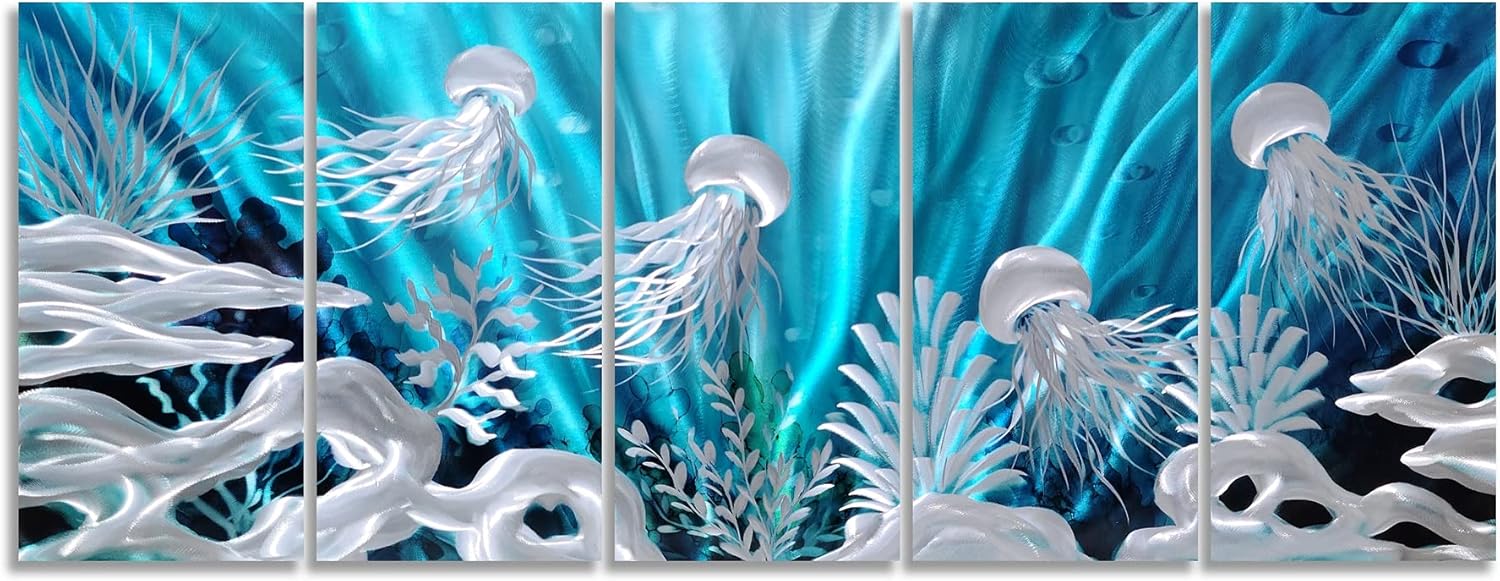 SYGALLERIER Jelly Fish Large Metal Wall Art Hand Grind Aluminum Artwork 3D Undersea World Coastal Pictures Nautical Decor for Living Room Bedroom