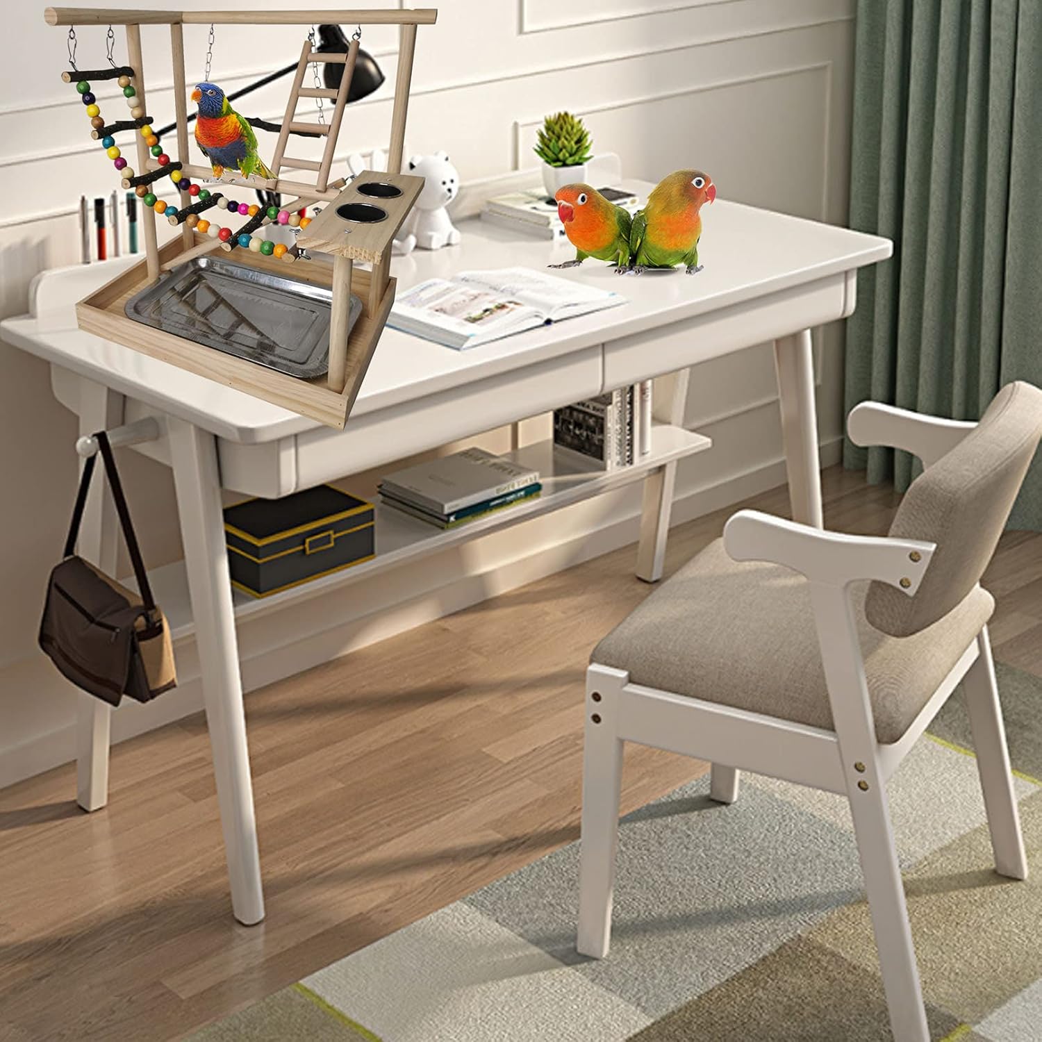 Hamiledyi Parrots Playground Bird Play Gym Wood Perch Stand Colours Climb Ladders Swing Chewing Toys with Parakeet Feeding Cups Exercise Activity Center for Conure Cockatiel Lovebirds(Include a Tray)