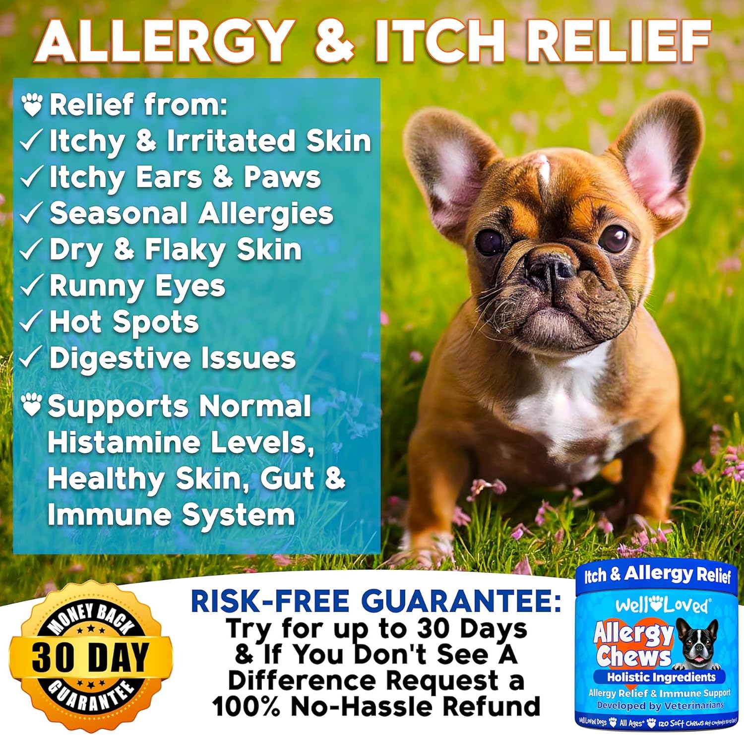 - 𝐑𝐈𝐒𝐊-𝐅𝐑𝐄𝐄 - Try our dog allergy chews for up to 30 days and if you don't see a difference in your dog simply contact Amazon and request a full refund.