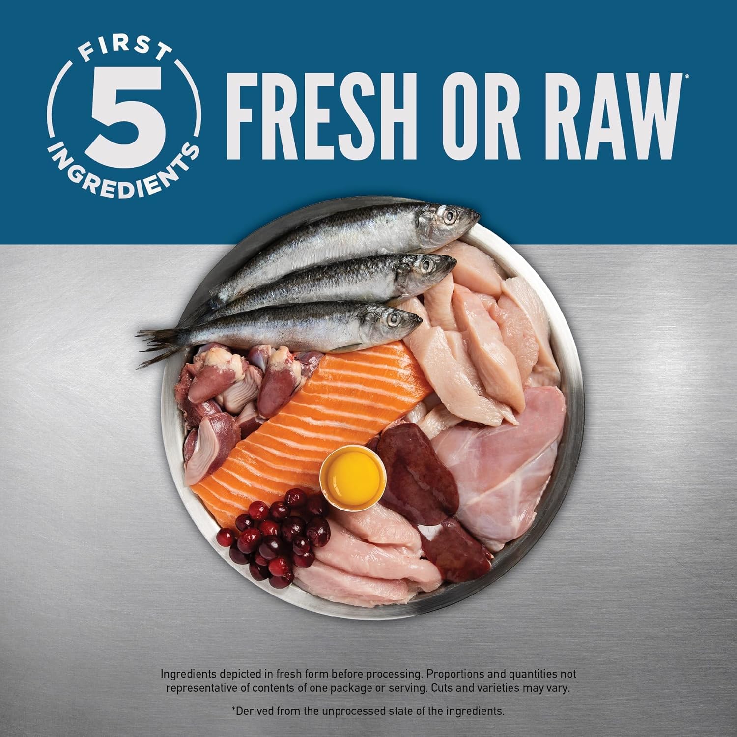 - First five ingredients are fresh or raw*, including chicken, wild-caught salmon and rabbit, and responsibly farmed pollock oil offers increased levels of Omega 3s, EPA and DHA