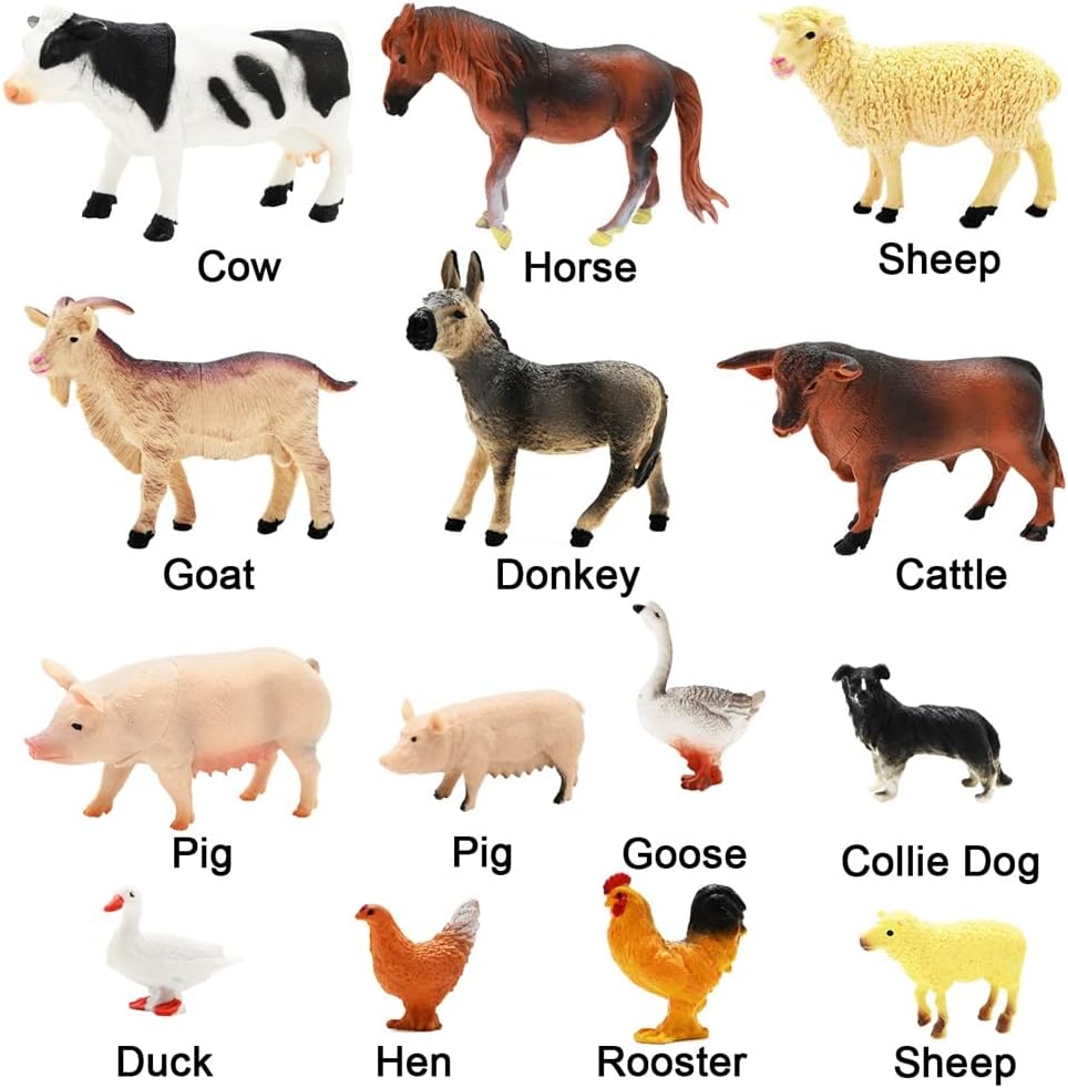 - 💗 SAFE & REALISTIC FARM FIGURES: 15 Pcs unique farm figurines with vibrant colors, 8pcs 4-5 inch big farm figures and 7pcs 2-2.5 inch mini farm figures, which are made of high quality durable ABS materials which is Eco-Friendly, plus hand-painted make them more realistic. KIMICARE's #1 priority is child safety.