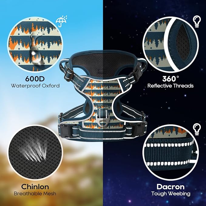 - 【MUCH SAFER & MORE COMFORTABLE】 Breathable mesh lining with soft sponge padding plate of puppy harness prevents injuries, giving extra comfort and protection with enhanced 1600D oxford fabric. The reflective material will be really nice when it gets dark. Also, your dog will be saw easily. This reflective material can make drivers have long time to react, which ensure your dog’s safety!