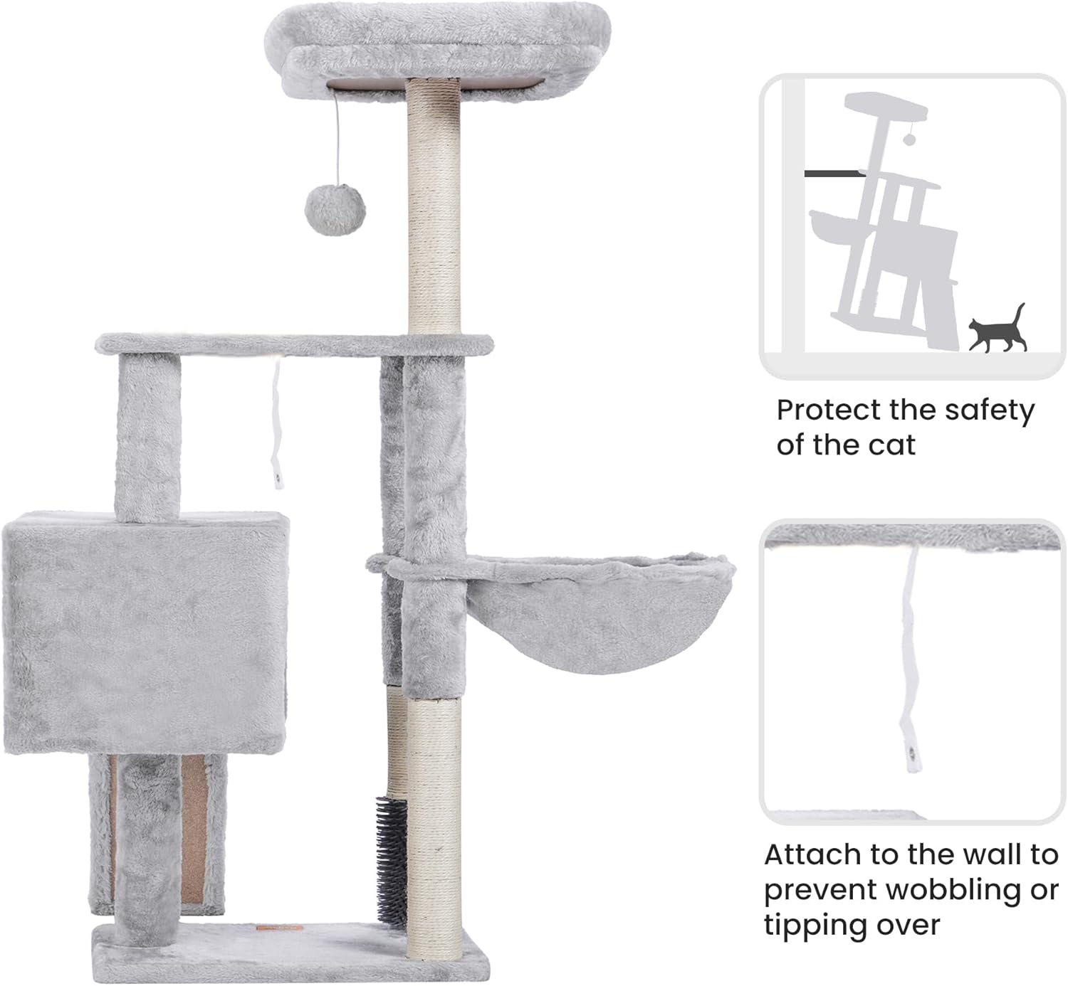Heybly Cat Tree with Cat Self Groomer Brush, Cat Tower Condo for Indoor Cats with Padded Plush Perch, Cat House with Basket Scratching Board Post, Light Gray HCT005SW