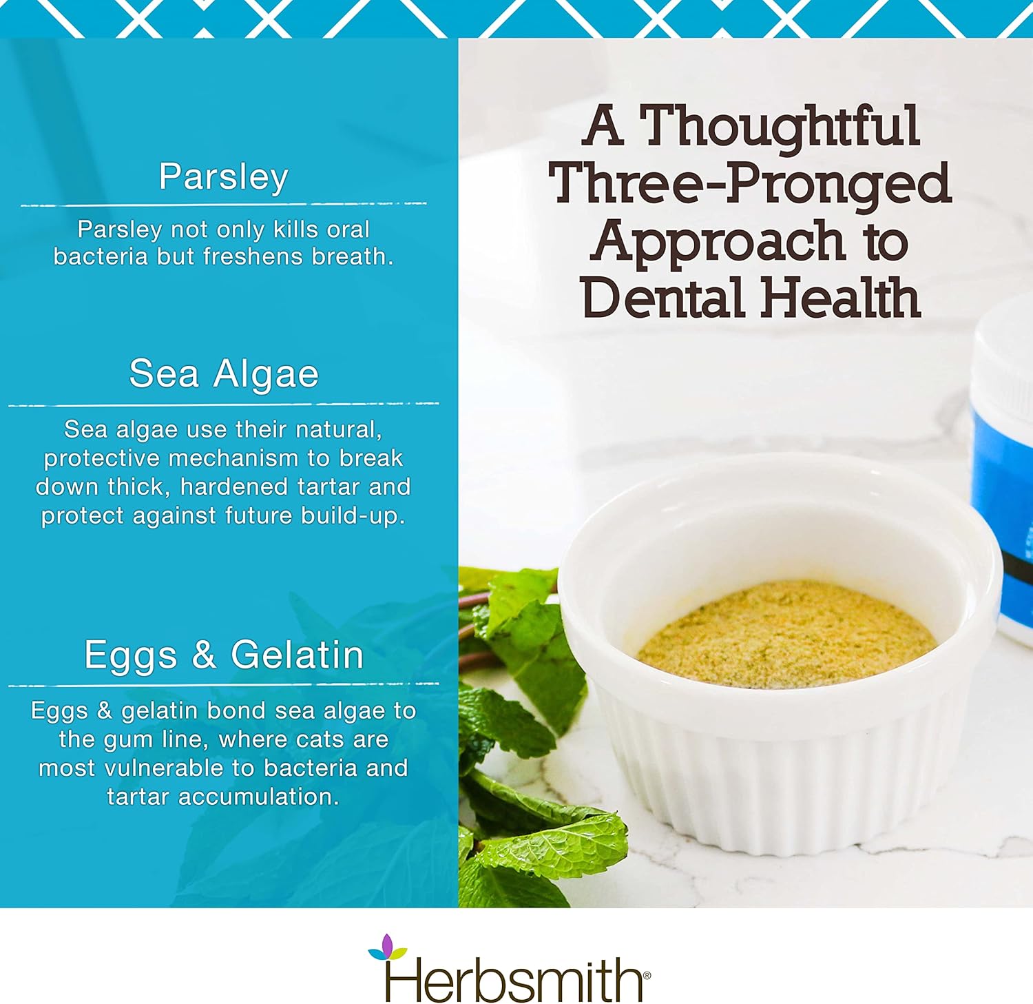 - SIMPLE, NATURAL INGREDIENTS - We use 100% all-natural ingredients to equip you with the highest quality dental product for your cat. With a blend of sea algae, spearmint, and parsley, this powder coats your kitty’s teeth and gums and springs into action for long-term dental health.