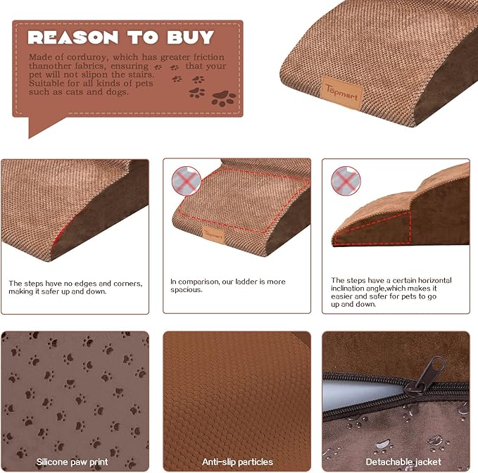 - Safer,Wider&Deeper Steps: Our dog stairs are excellent for those older dogs who are less mobile as they age or for cats with injuries. More wide and deep steps are helpful for reducing the strain that constantly jumping up and down onto lower bed,sofa can have on your pet's joints,and topmart dog steps will not shake and slip during use. The cover made of corduroy is more frictional than other covers, pets will not slip on the stairs.