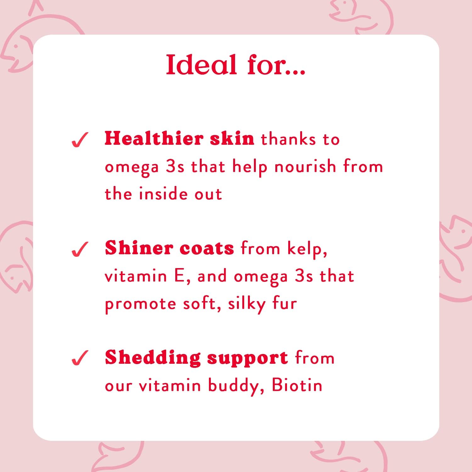 - Simple, Functional, Fun: With Wild Alaskan Salmon Oil, Kelp, and Biotin all packed into our trustworthy "B" shaped soft chews. Ohand they taste good, too!