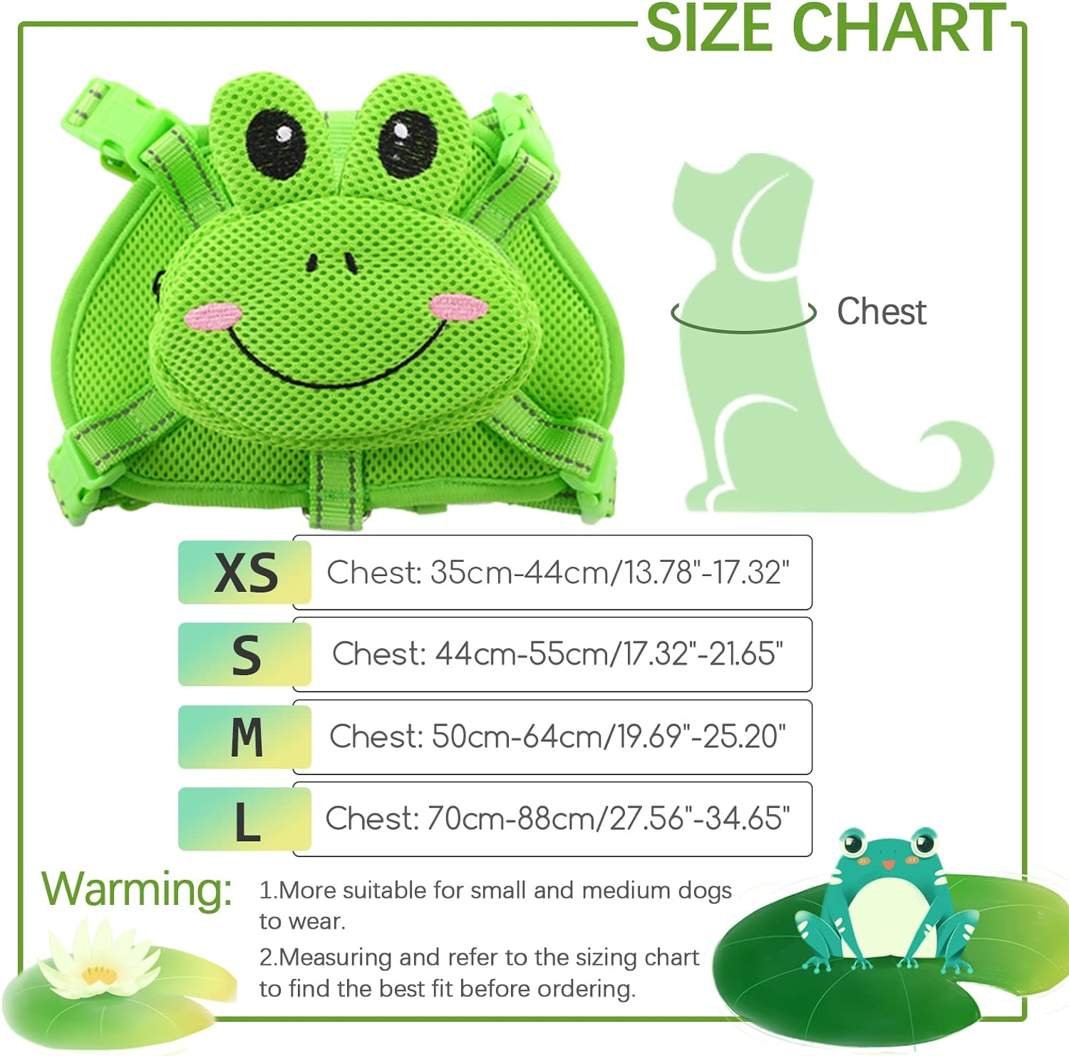 - LARGE CAPACITY:The dog harness backpack has a main bag with zipper design on the back, matches with cute green frog shape, which is eye-catching and have large capacity. The dog vest backpack can carry dog food and snacks, collapsible bowls and cups, small water bottles, toys and your keys.