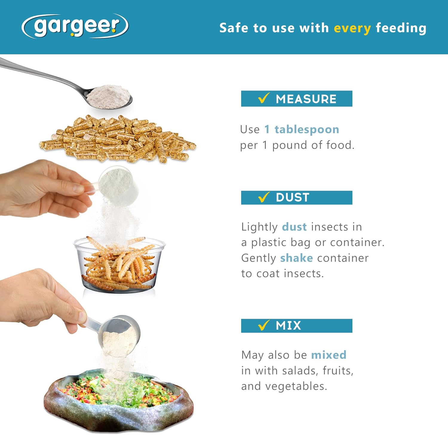 - STICK WITH US. Gargeer’s ultrafine calcium particles stick better to feeder insects and mix well into salads. DO NOT ADD DIRECTLY INTO WATER.