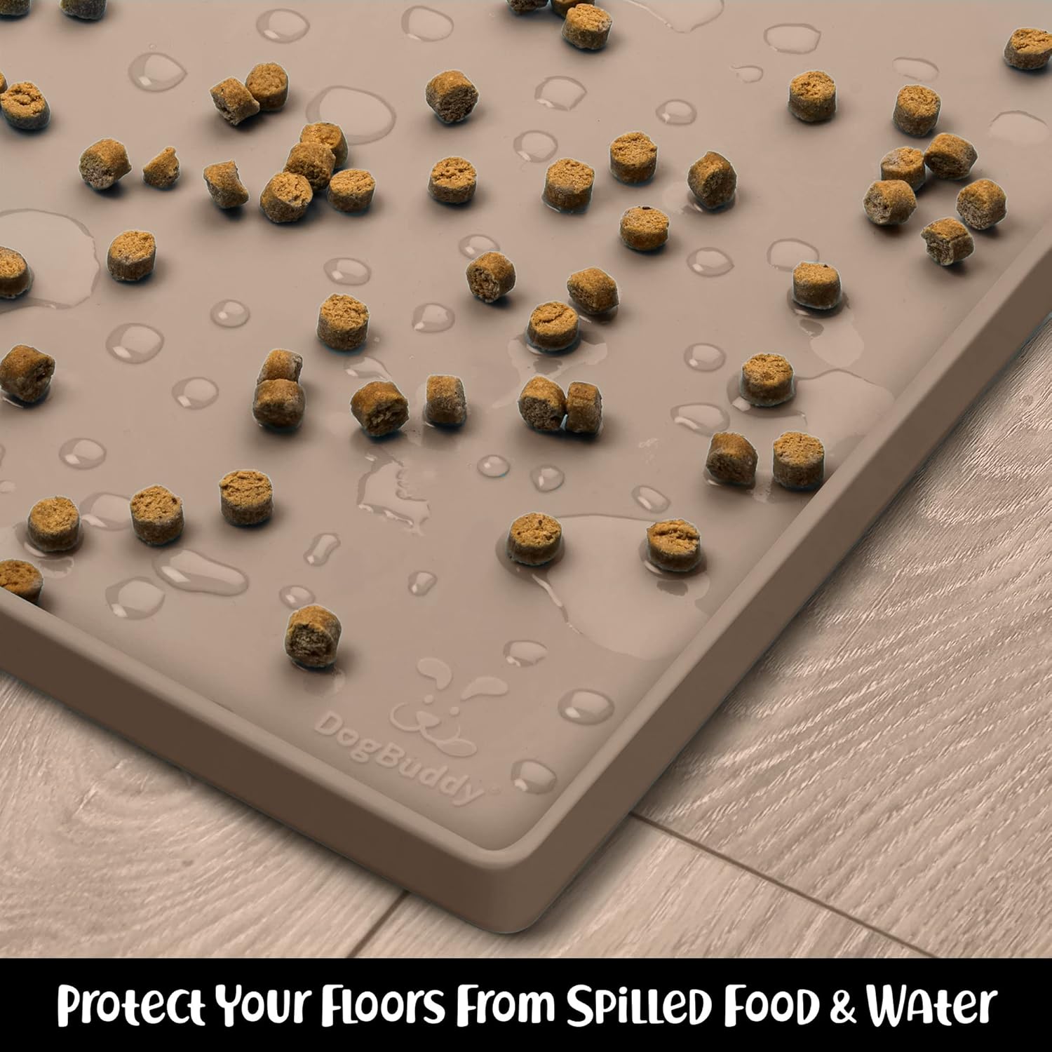 - Less Mess & Less Stress: Super high edge (0.6”) of DogBuddy Dog Food Mat keeps the spilled food and water on the mat and away from your beautiful floor. Silicone is naturally 100% waterproof, so what happens on the mat stays on the mat.