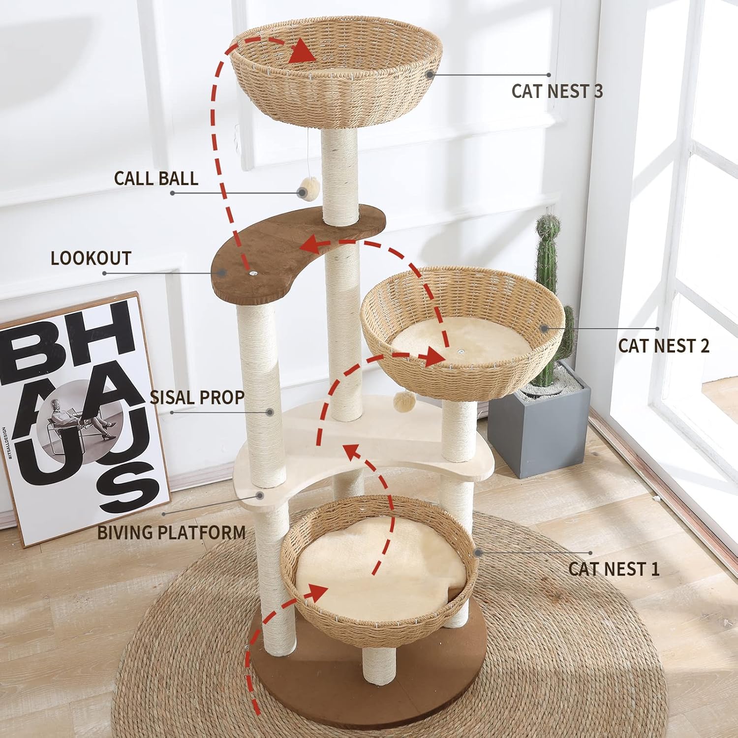 52" Modern Cat Tree Tower for Large Cats, 3Cat Nests Manual Hand Woven Multilevel Huge Paws Pals Cat Tree, Wood Cat Tower, Cat Scratching Tree, Cat Condo, Cat Lover Gift