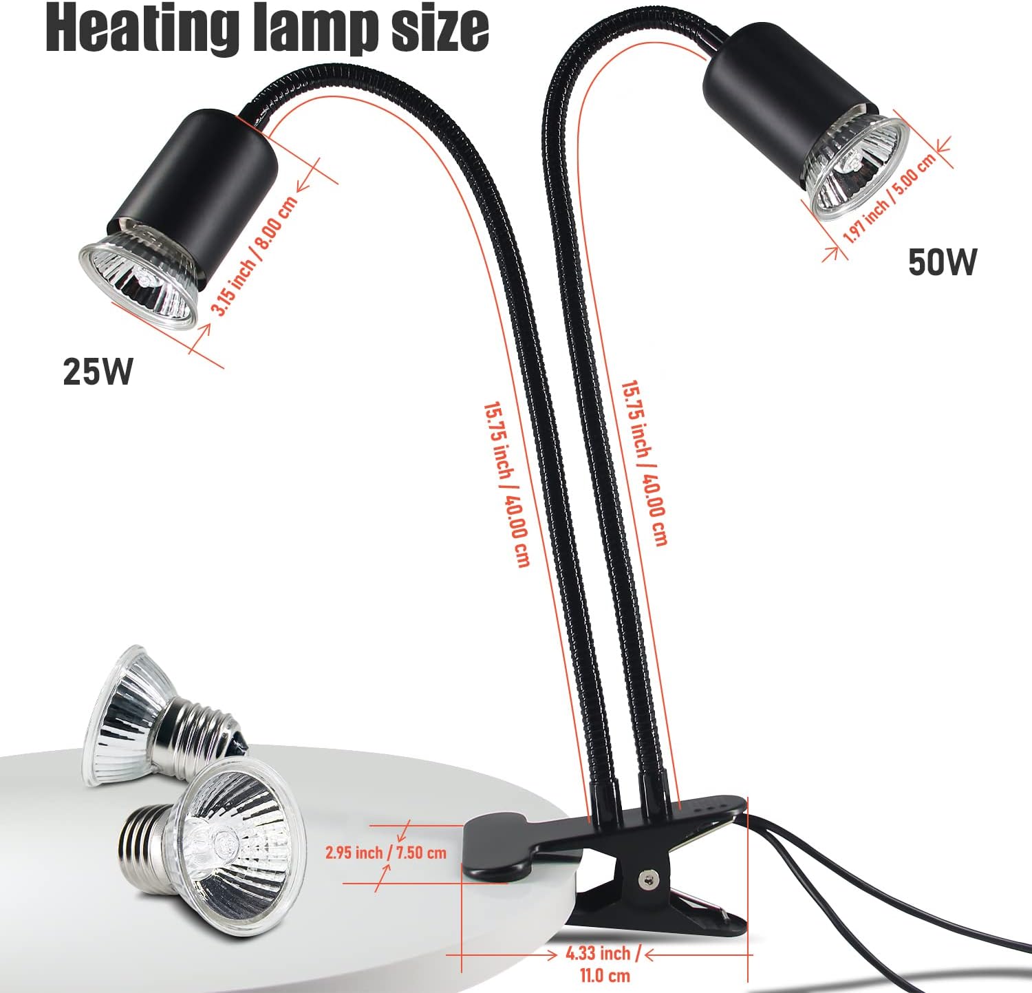 Reptile Heat Lamp, Double-Head Heat Lamp with Clamp, UVA UVB Reptile Light with Intelligent Cycle Timer for Turtle, Bearded Dragon, Lizard and More, 2 Bulbs 25W+50W
