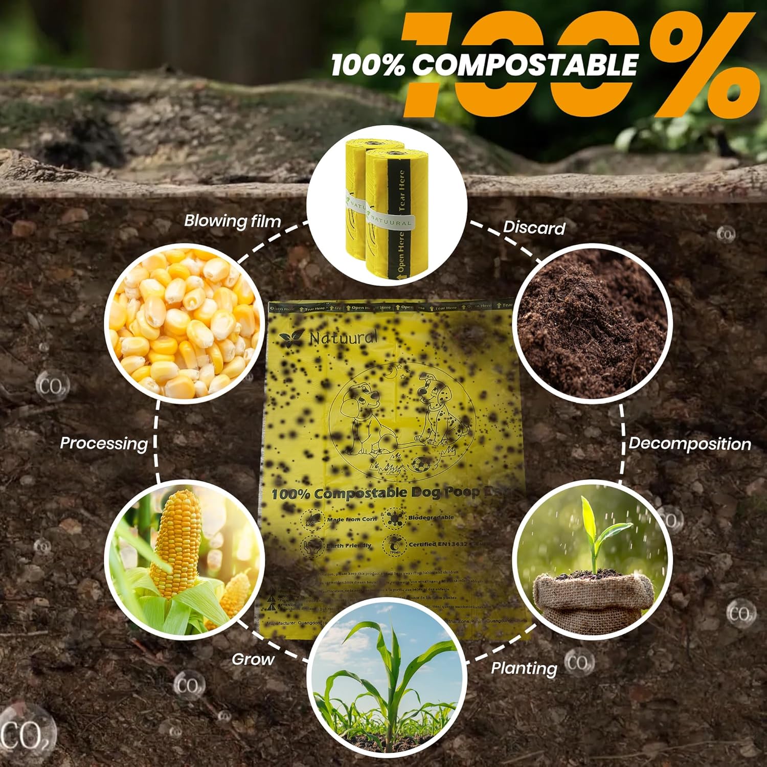 - [Certified Compostable] These compostable dog poop bags are designed from plant-based materials. We only use corn starch, PBAT (fully compostable polymers) of our doggie poop bags. they are complying with the highest standards of US ASTM D6400, NF T51-800:2015 and EU EN13432, they are easy to open and durable!