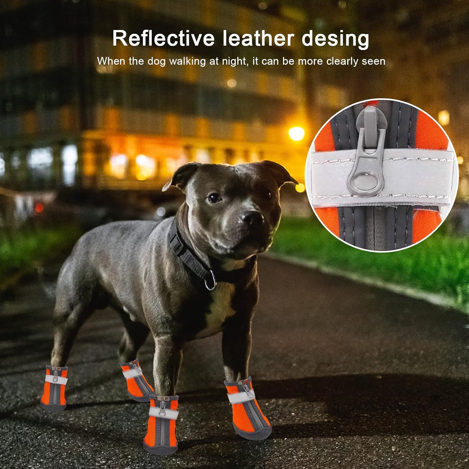 - 【ADJUSTABLE & REFLECTIVE STRIPS】These dog boots are easy to put on and take off, and the double straps can be adjusted with long straps to fix. When putting on dog shoes, please fasten the long belt, which can effectively prevent the shoes from falling off. At night, reflective strips on dog shoes make it easier to find your dog.