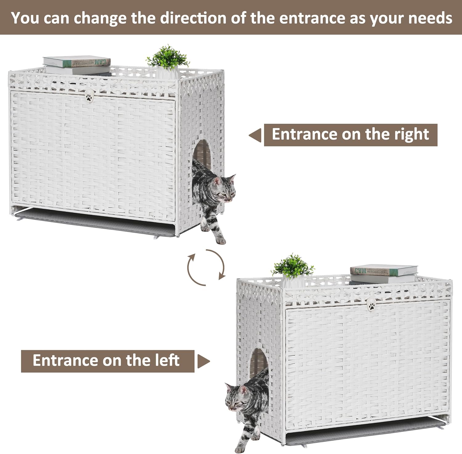 - 【More sunshine, Less odor】 The cat litter box enclosure offers a private place where cats feel safe to answer nature’s call. The rattan cat litter box enclosure can transmit light, allowing cats to enjoy the sunshine while blocking odor emission.