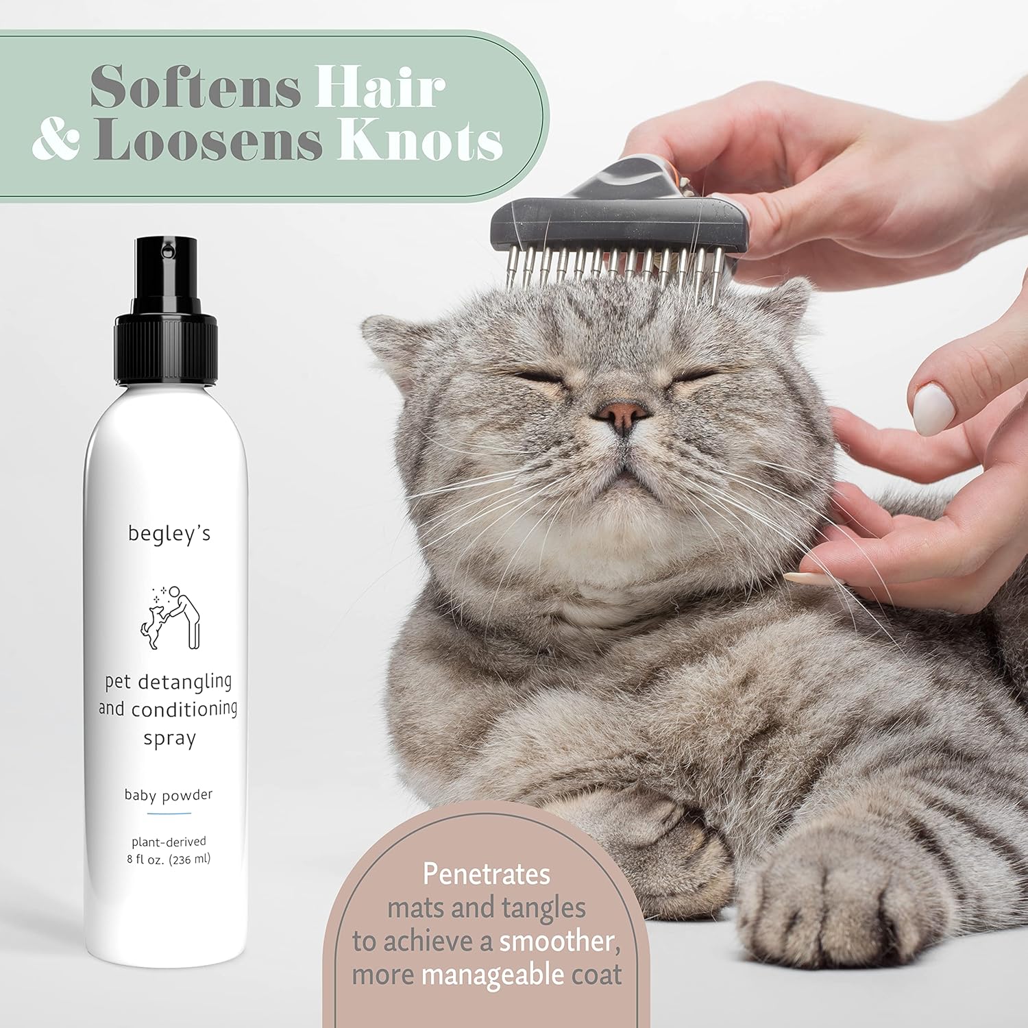 Begley's Pet Detangling Spray - Premium Essential Oil Scented Detangler Spray for Dogs, Puppies & Cats - Dog Leave in Conditioner Spray - Dematting Spray for Dogs & Pets - 8 oz, Baby Powder