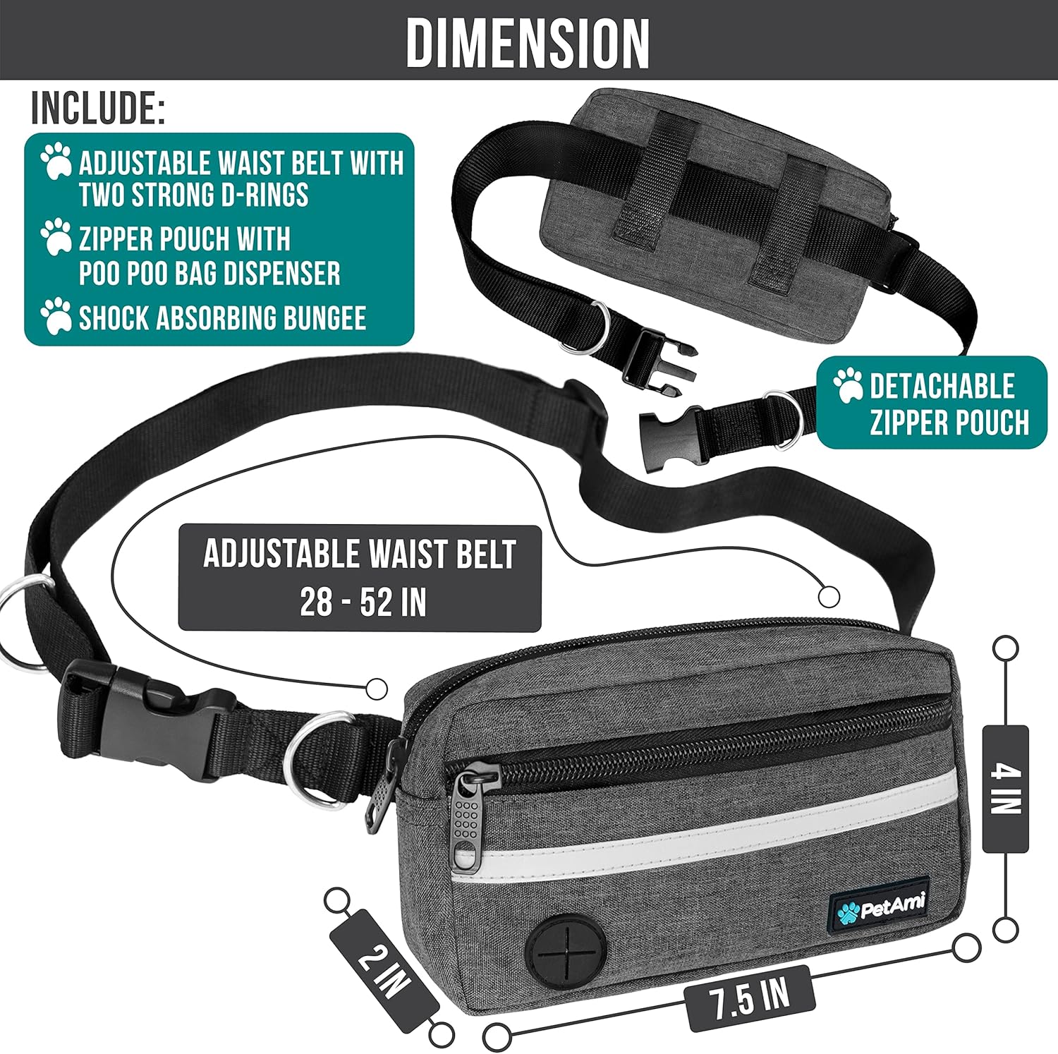 - AROUND THE WAIST DOG LEASH FOR RUNNING: PetAmi Dog walking fanny pack reinforced an extra padded bungee cord leash handles for superior grip and control while you are jogging, walking or training dogs. Our wearable hip dog walking bag also features a safety reflective trim on its front ensuring both you and your dog are easily visible to others, enhancing safety and visibility. Enjoy the perfect blend of security and comfort with PetAmi waist belt bag with dog leash for large dogs.