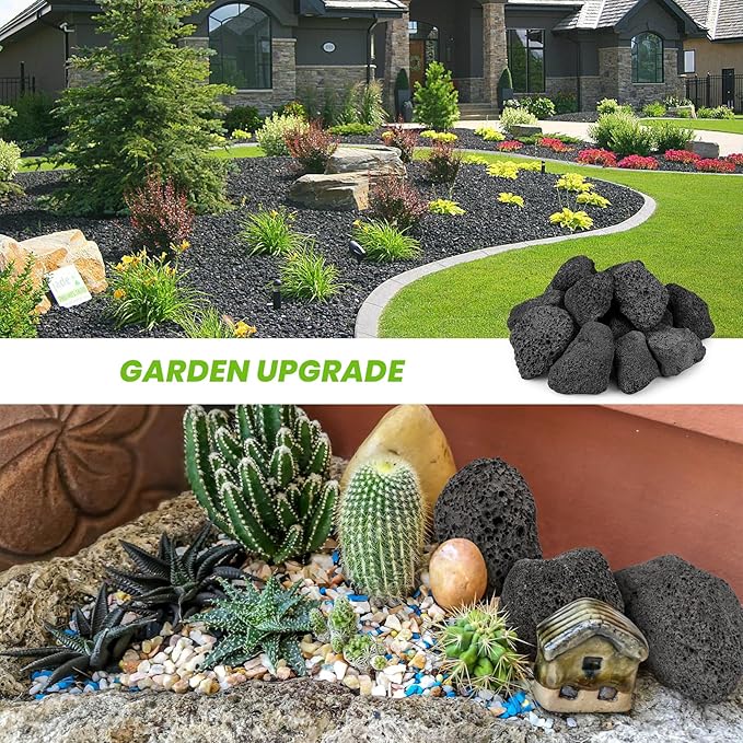 - 【Natural Epic Decoration】 - With an earthy, natural look, Lava Rock complements many landscapes by adding texture, color, and depth. It works well as a transitional rock between two landscapes. It also does a wonderful job as mulch in garden bedsIt to cover the entire exposed aggregate flooring effectively hiding the unseemly pipes and tubes. It adds an extra beauty as decoration for any leisure spaces like garden, lawn, walkway, fountain, terrarium, vase filler, potted plant, craft project.