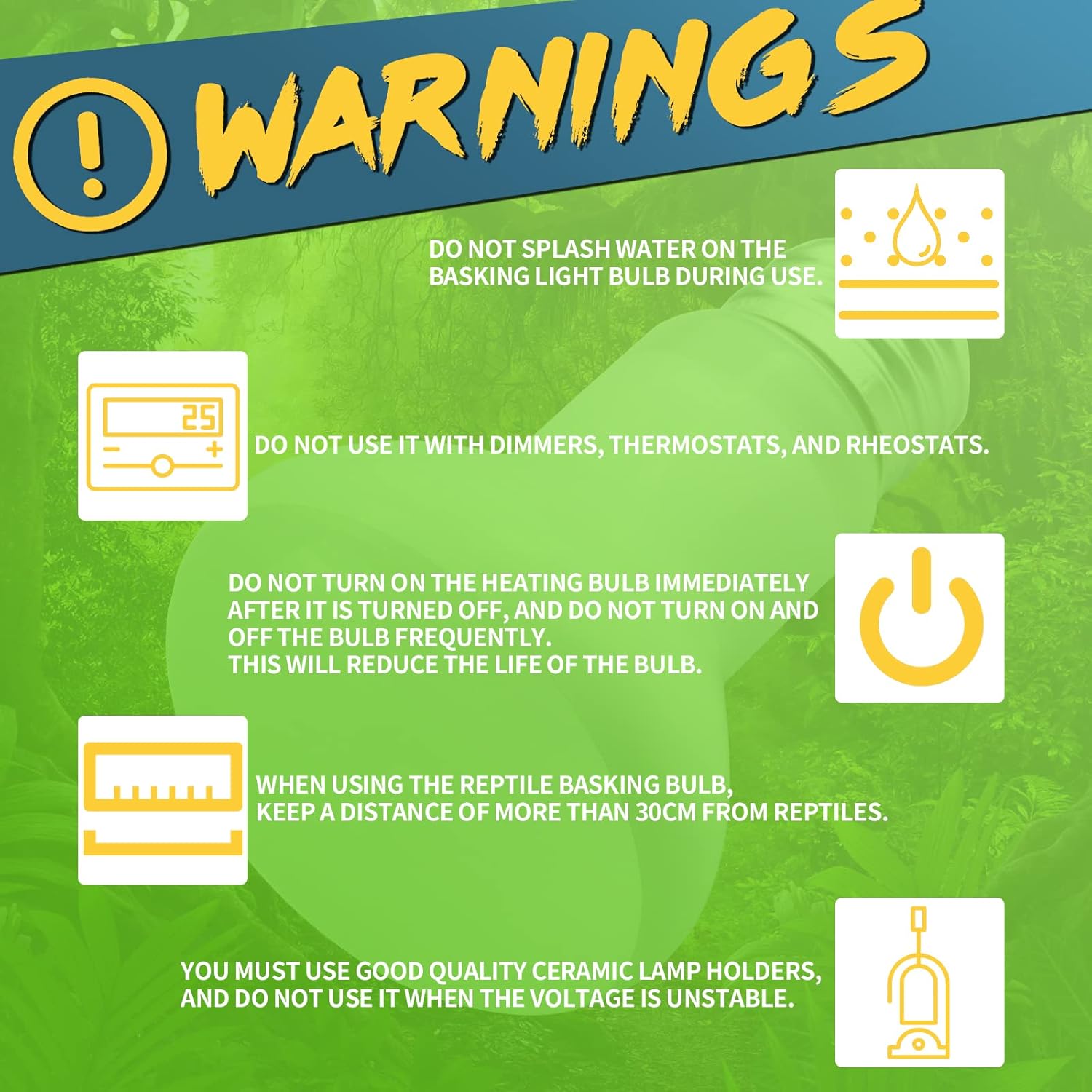- 🦎Safety Instructions - You must use good quality ceramic lamp holders, and do not use it when the voltage is unstable. Do not use it with dimmers, thermostats, and rheostats. Do not splash water on the basking light bulb during use. When using the reptile basking bulb, keep a distance of more than 30cm from reptiles. Do not turn on the heat bulb immediately after turning it off, and do not turn the bulb on and off frequently.