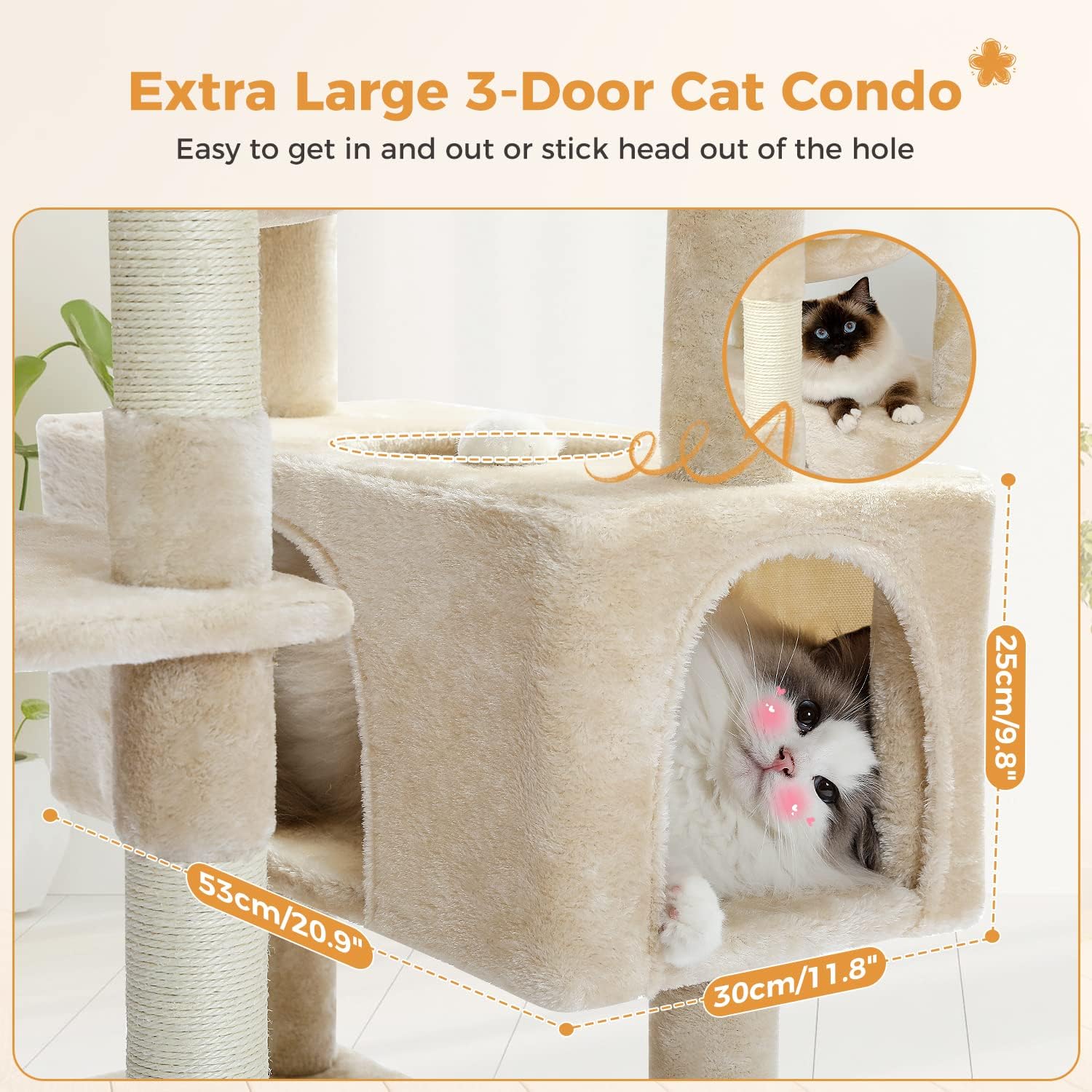 PAWZ Road Large Cat Tree, 72 Inches Cat Tower for Large Cats, Cat Condo with Sisal-Covered Scratching Posts and Pads, 2 Padded Perch, Dual Condo and Basket for Indoor Cats-Beige