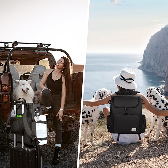 - MULTI-COMPARTMENT DOG TRAVEL BAG: This large dog backpack has a large inner compartment to store dog food, dog travel water dispenser, dog beach essentials and so on. The side pocket of this dog accessories backpack with zipper is for extracting tissue and dog poop bags. The top pocket on the dog travel bag is easy for you to hold your daily stuffs.The front pocket also folds down as a mat for easy and convenient pet feeding