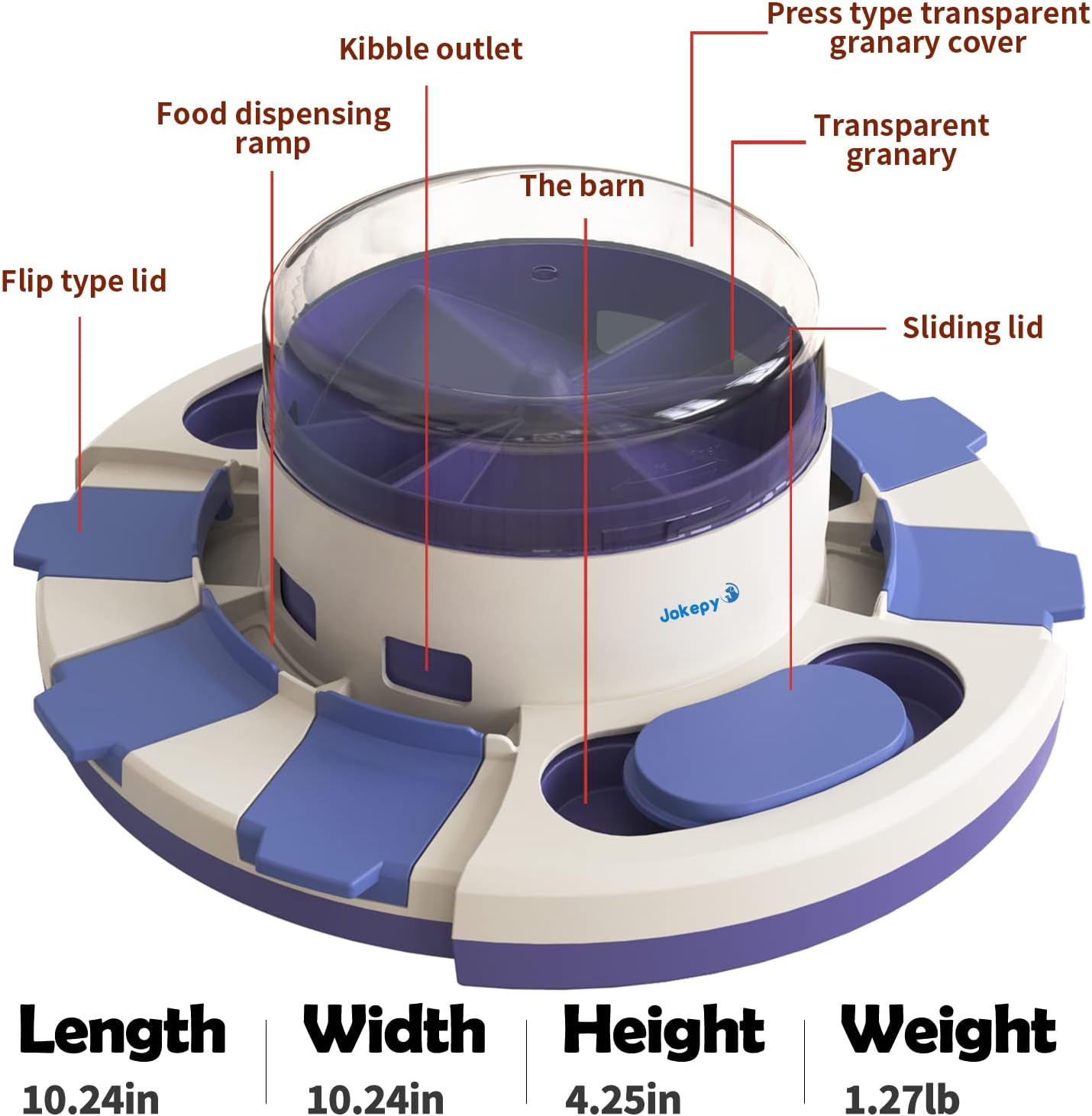- đžăEasy to UseăDog puzzle toys have 6 flip type lids, you can add food to the granary, pets press down on the transparent lid, food will fall into the leaky food-box. Pets also can eat food by moving 2 sliding lids.