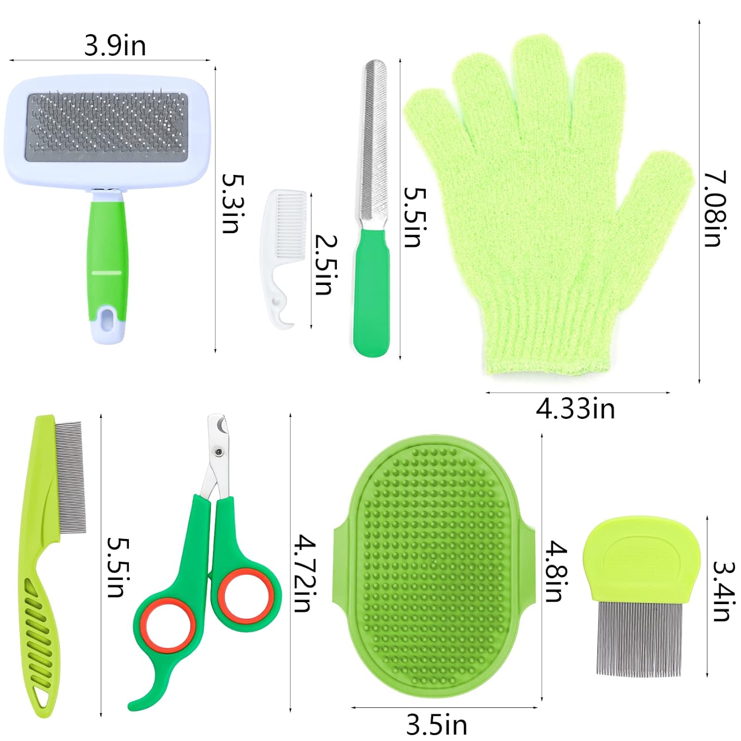 VCZONE 8 Pcs Small Animal Grooming Kit, Pink with Pet Nail Clipper and File, Flea Comb, Pet Shampoo Bath Brush, Pet Shedding Slicker Brush, Bath Massage Glove, Cleaning Comb (Green)
