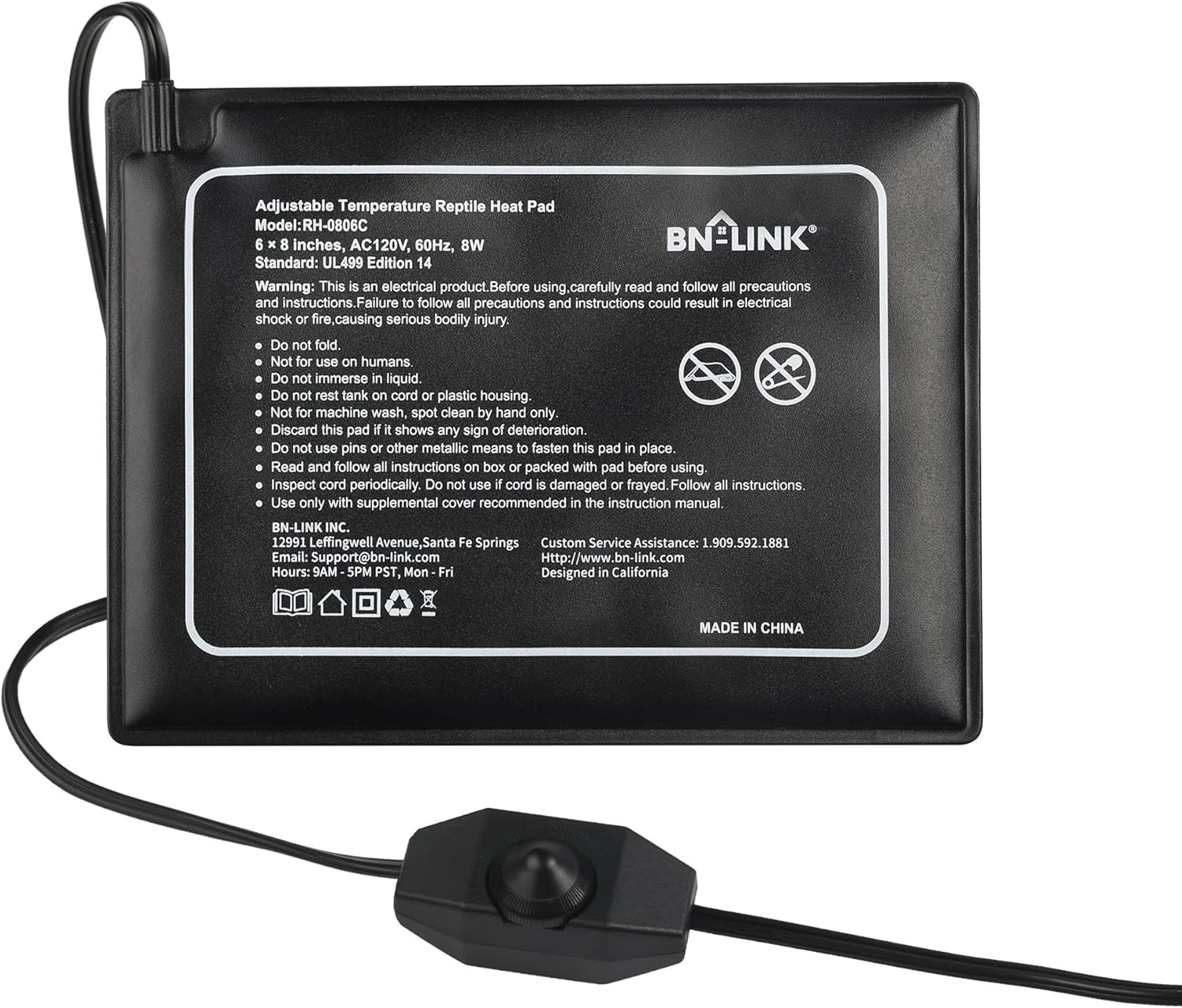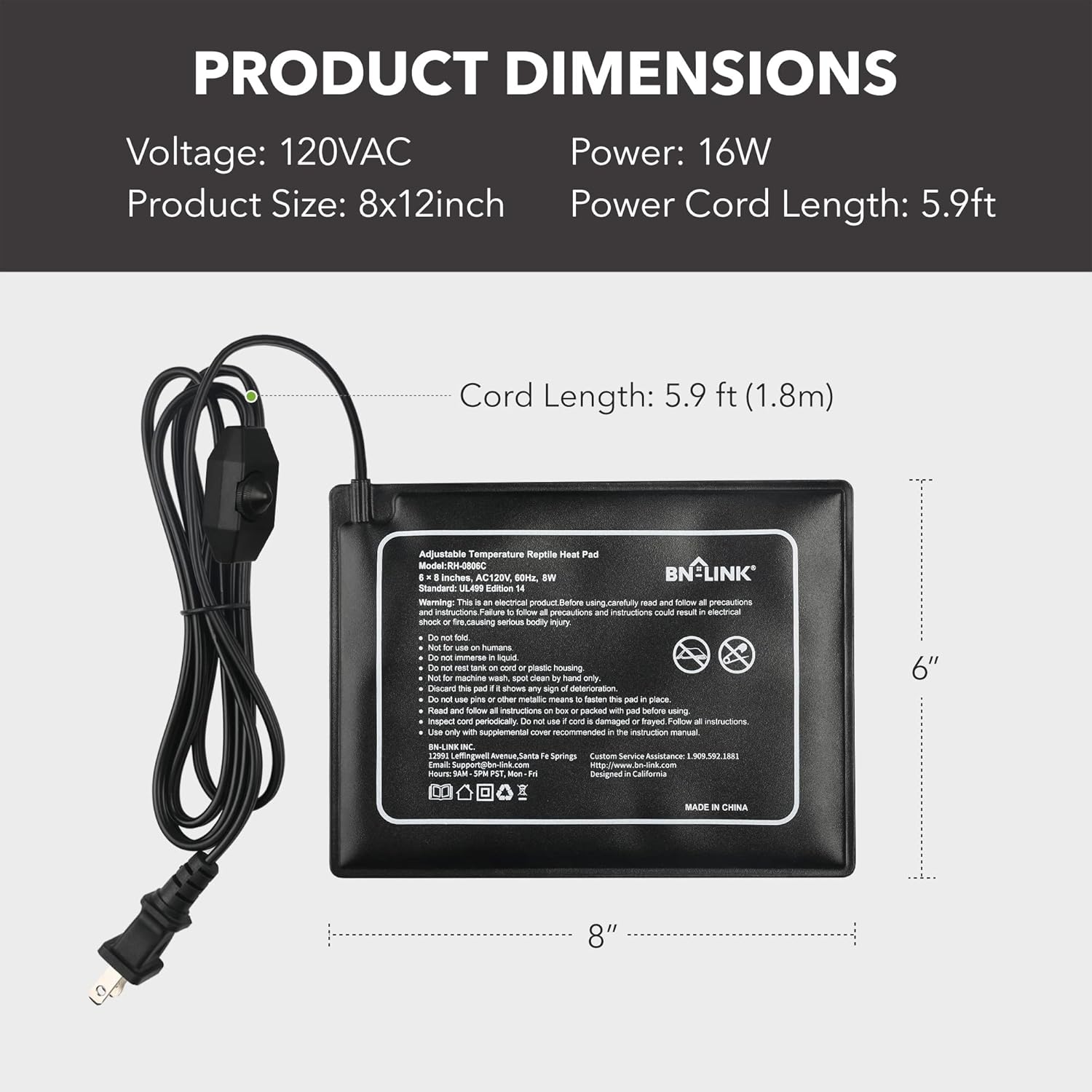 - MADE FOR REPTILES: Voltage: 120 volt, Power: 8 watt. The 6" x 8" with adjustable knob model is perfect for a 10 -20 gallon terrarium and it can easily put out steady heat between 104℉ and 122℉. Each unit comes with BN-LINK’s strong 15-month warranty.